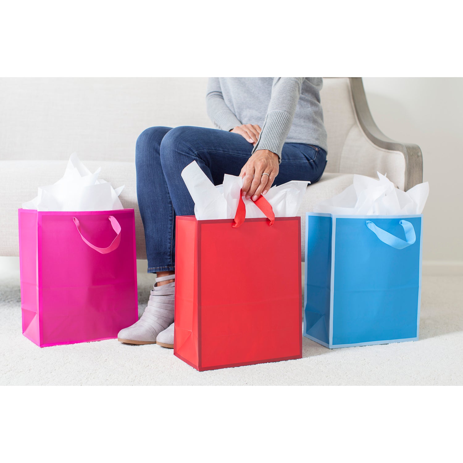 All-occasion Large gift bag 3-pack is perfect for family and friends for presenting a special gift. Each solid colour bag features contrast trim in blue, hot pink and red with matching ribbon handles