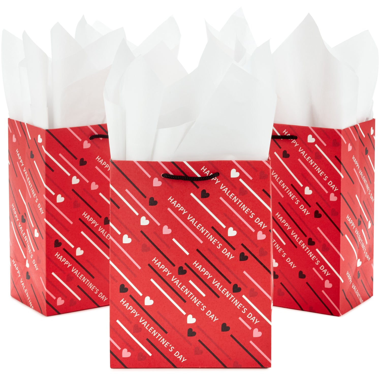 Hallmark 8" Medium Valentine's Day Gift Bags with Tissue Paper (3 Bags: Red with Black, Pink, White Stripes and Hearts)