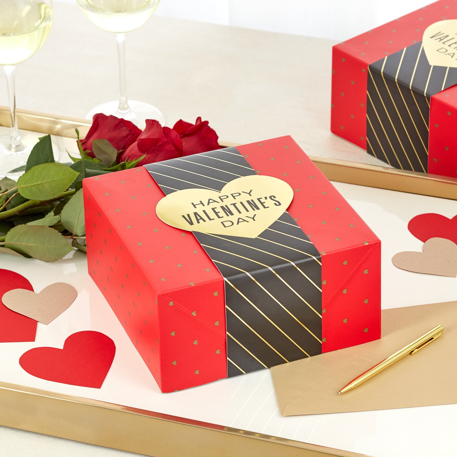 CLASSIC DESIGN: Medium red gift boxes feature gold foil polka dots and a black and gold wrap band with a metallic gold heart that reads "Happy Valentine's Day."