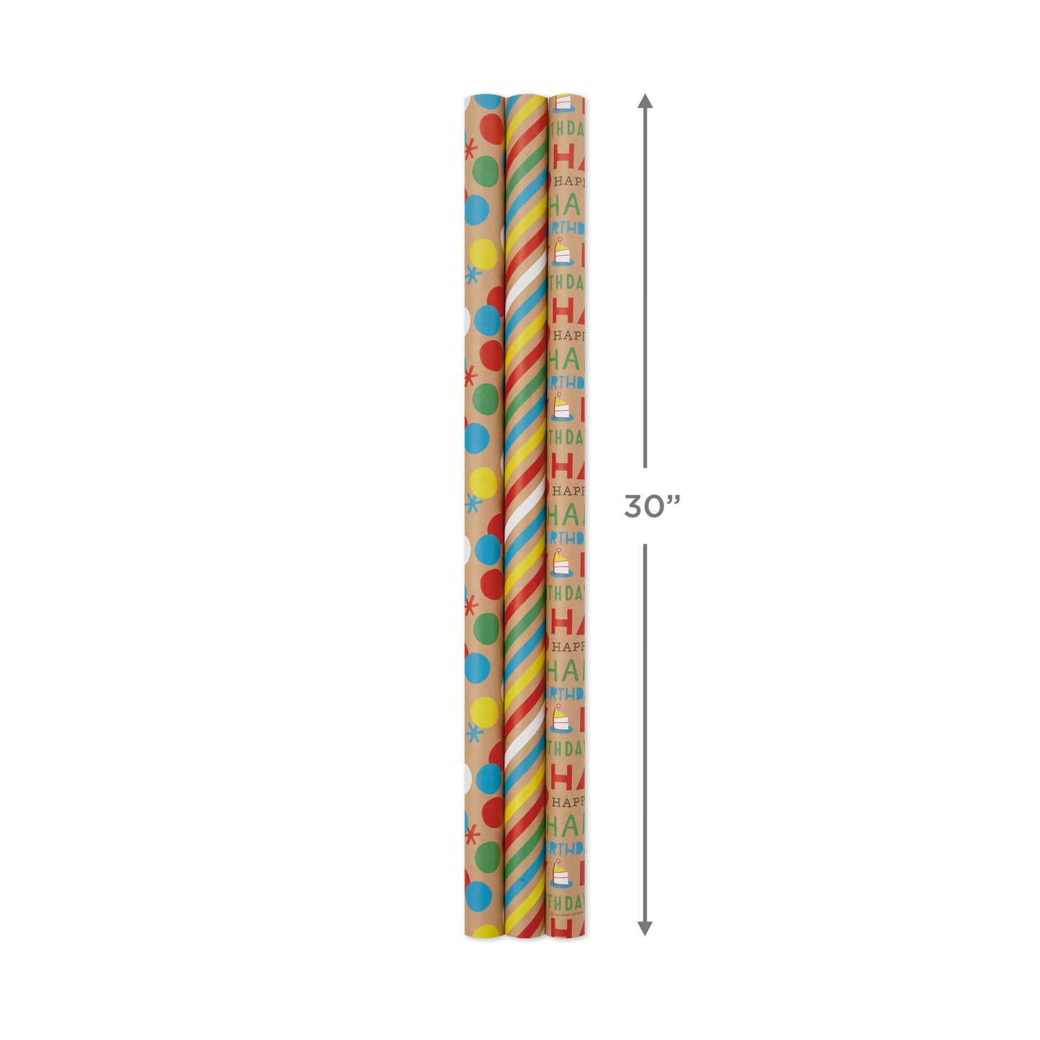 Hallmark All Occasion Kraft Wrapping Paper Bundle: Birthday, Stripes, Dots with Kraft on Reverse (3-Pack: 105 sq. ft. ttl.) for Valentines Day, Kids Parties, Crafts, DIY Decorations and More
