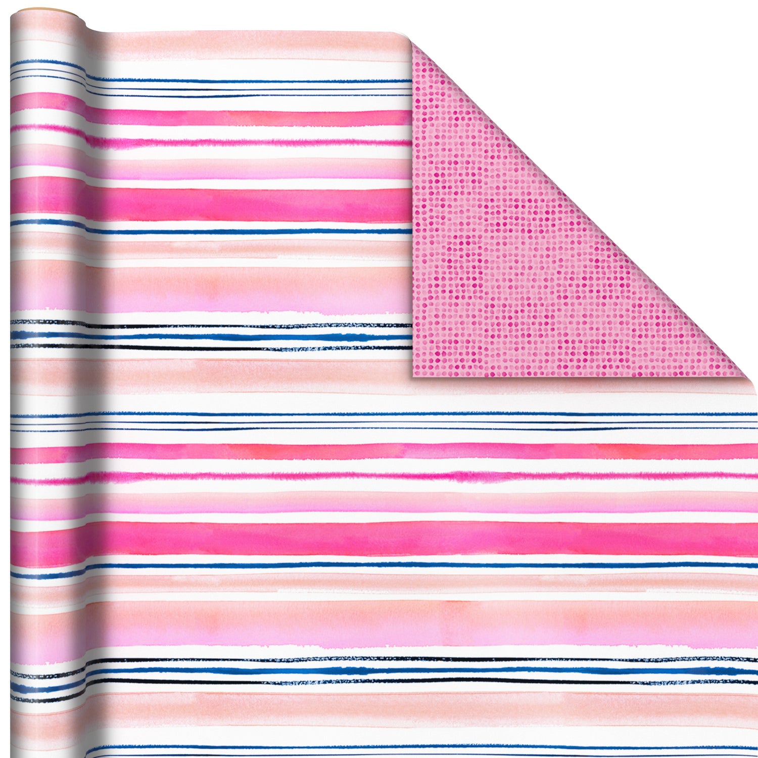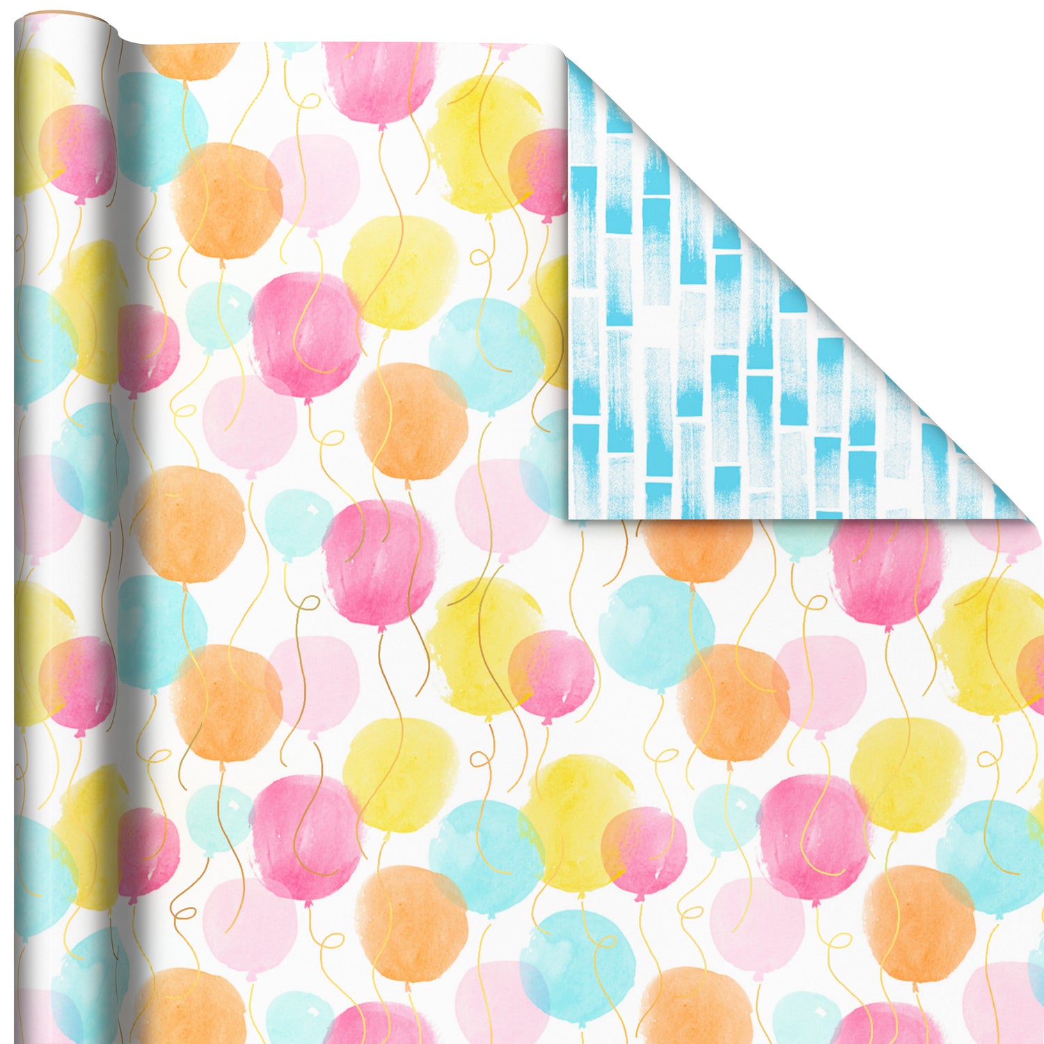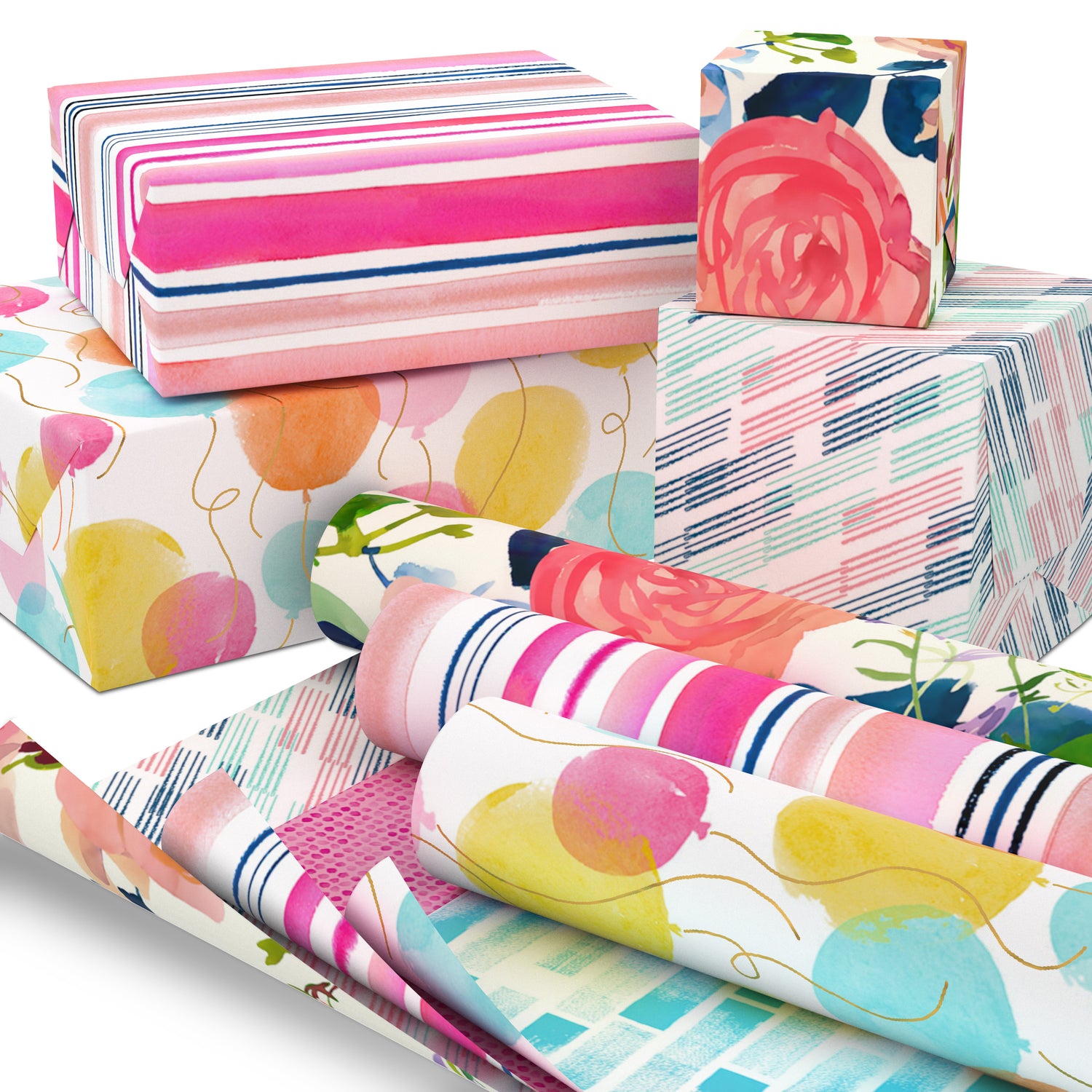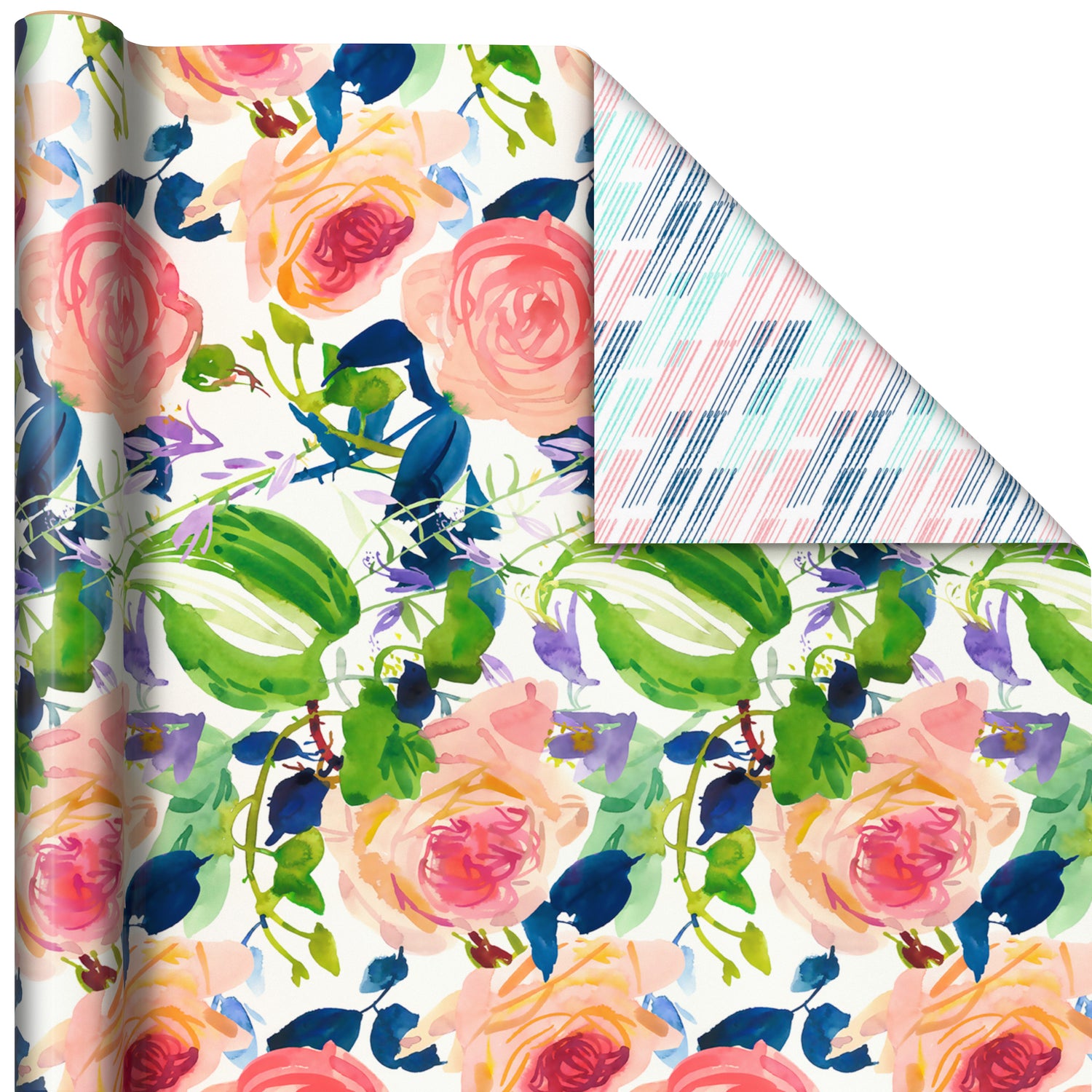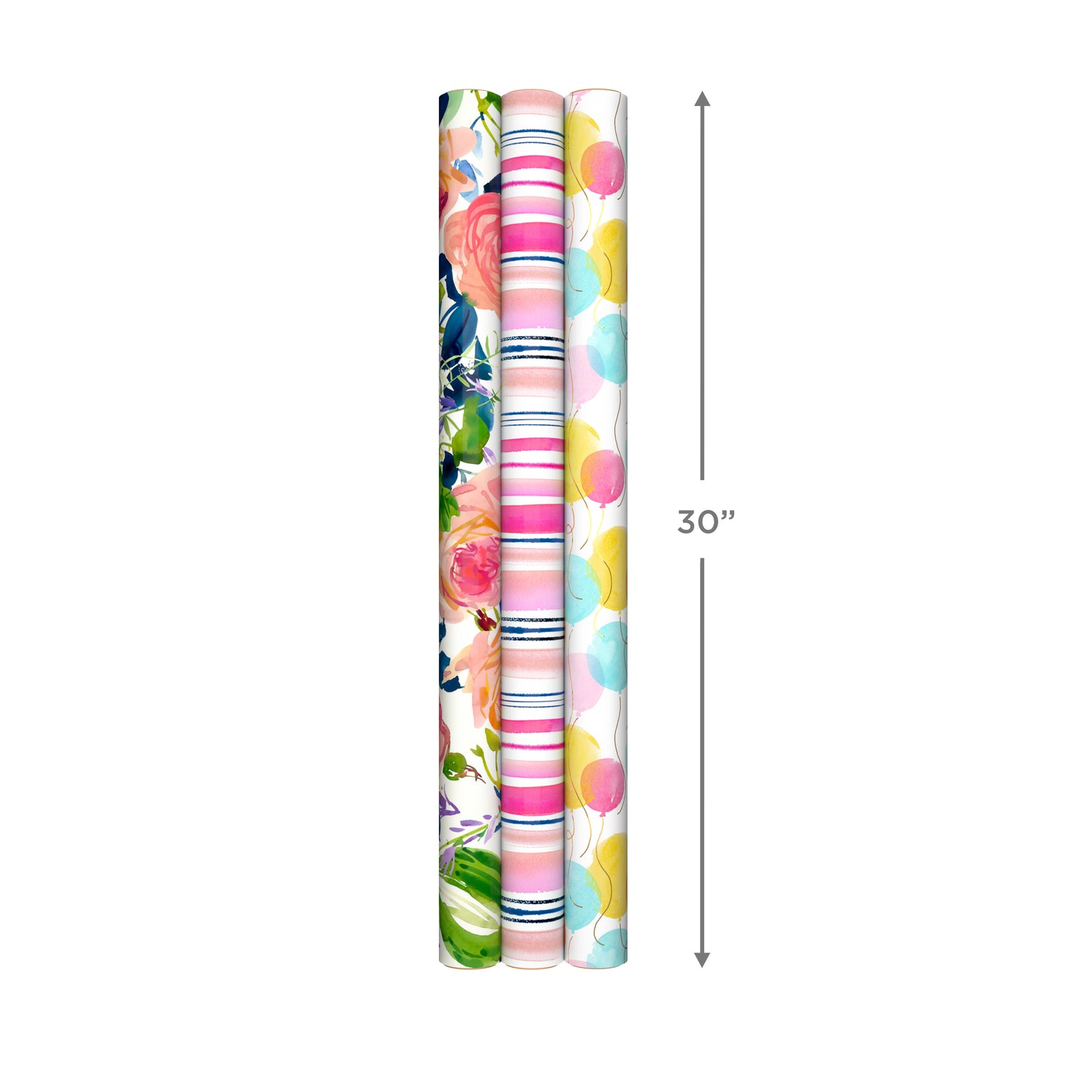 Hallmark All Occasion Reversible Wrapping Paper Bundle - Watercolor Flowers, Stripes, Balloons (3-Pack: 75 sq. ft. ttl.) for Birthdays, Weddings, Baby Showers, Bridal Showers, Valentine's Day and More