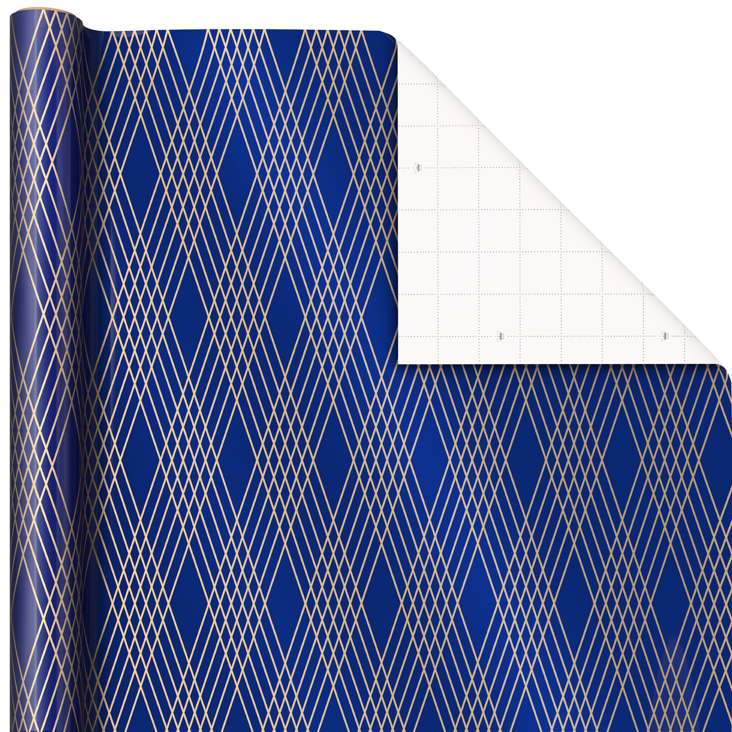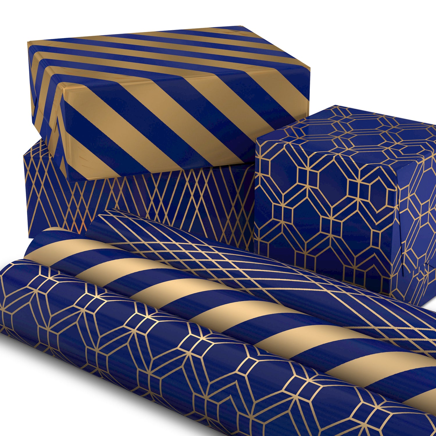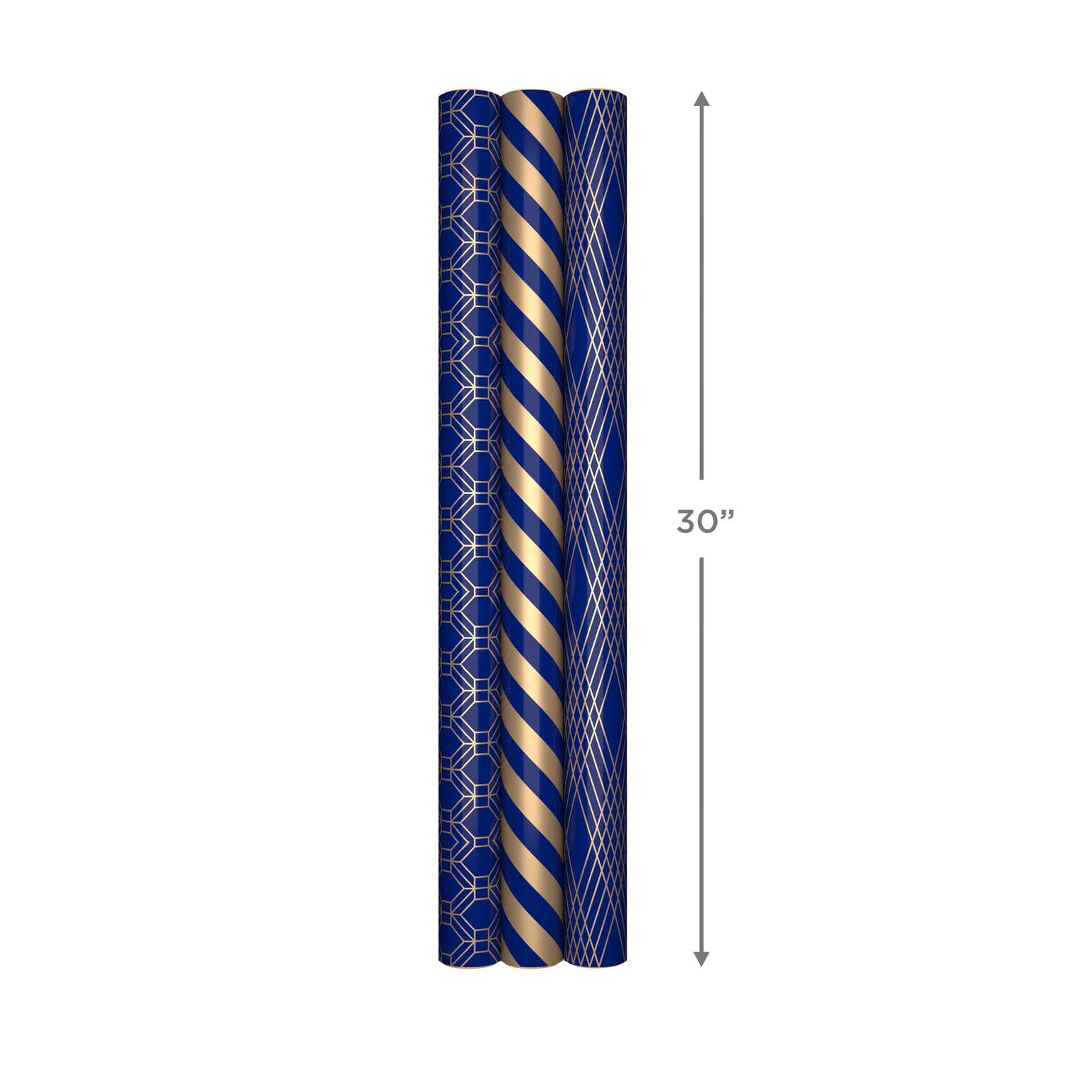 Hallmark All Occasion Wrapping Paper Bundle with Cut Lines on Reverse - Dark Blue and Gold (3-Pack: 105 sq. ft. ttl.) for Birthdays, Weddings, Valentine's Day, Graduations, Father's Day