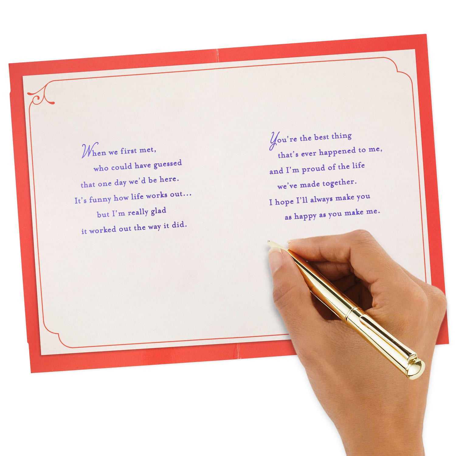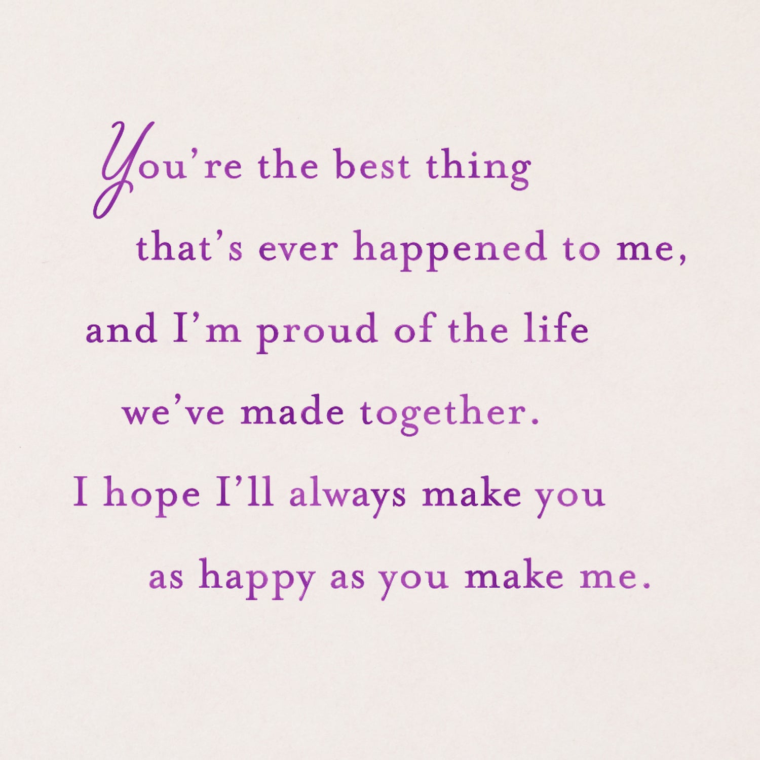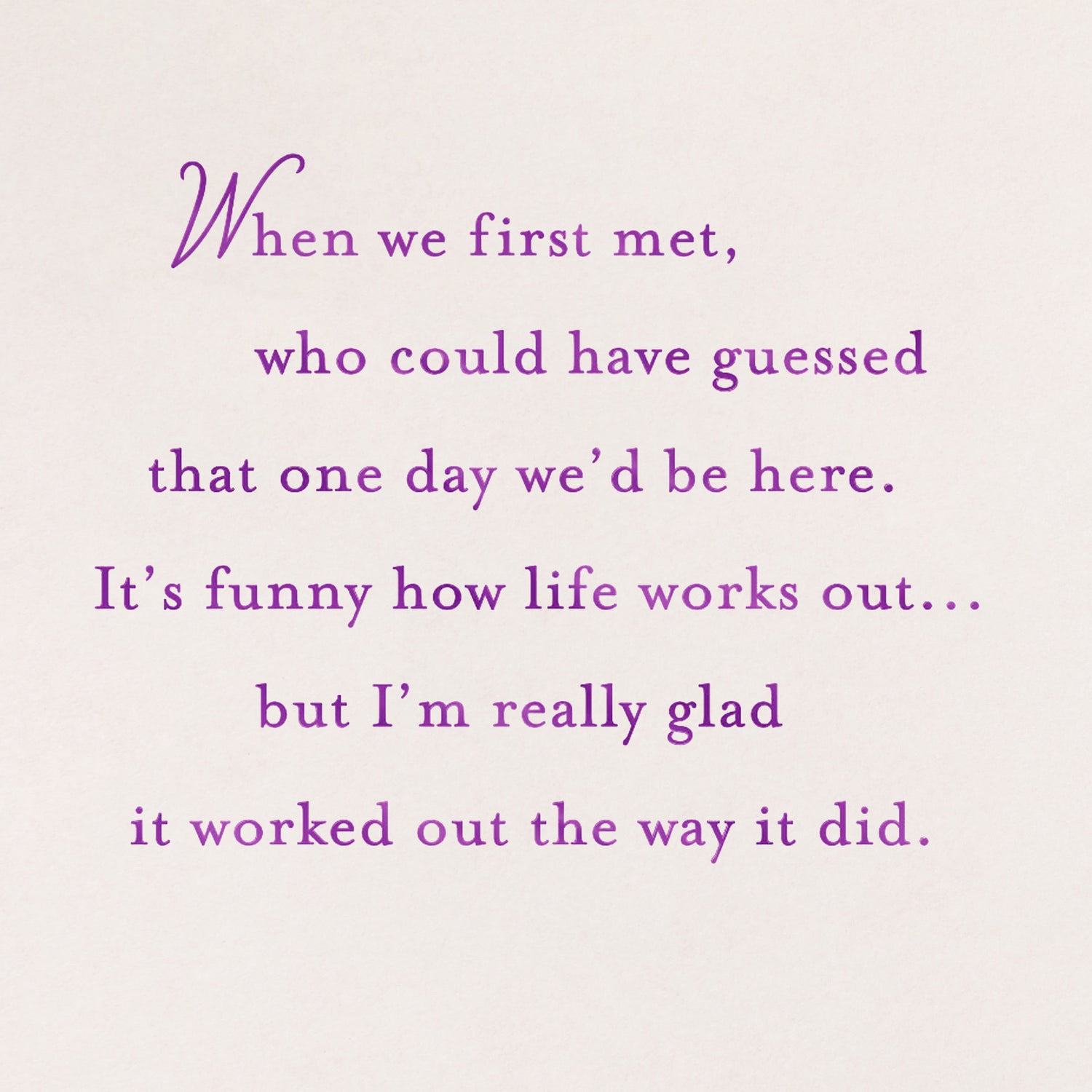 Inside reads: "When we first met, who could have guessed that one day we'd be here. It's funny how life works out . . . but I'm really glad it worked out the way it did. You're the best thing that's ever happened to me, and I'm proud of the life we've made together. I hope I'll always make you as happy as you make me."