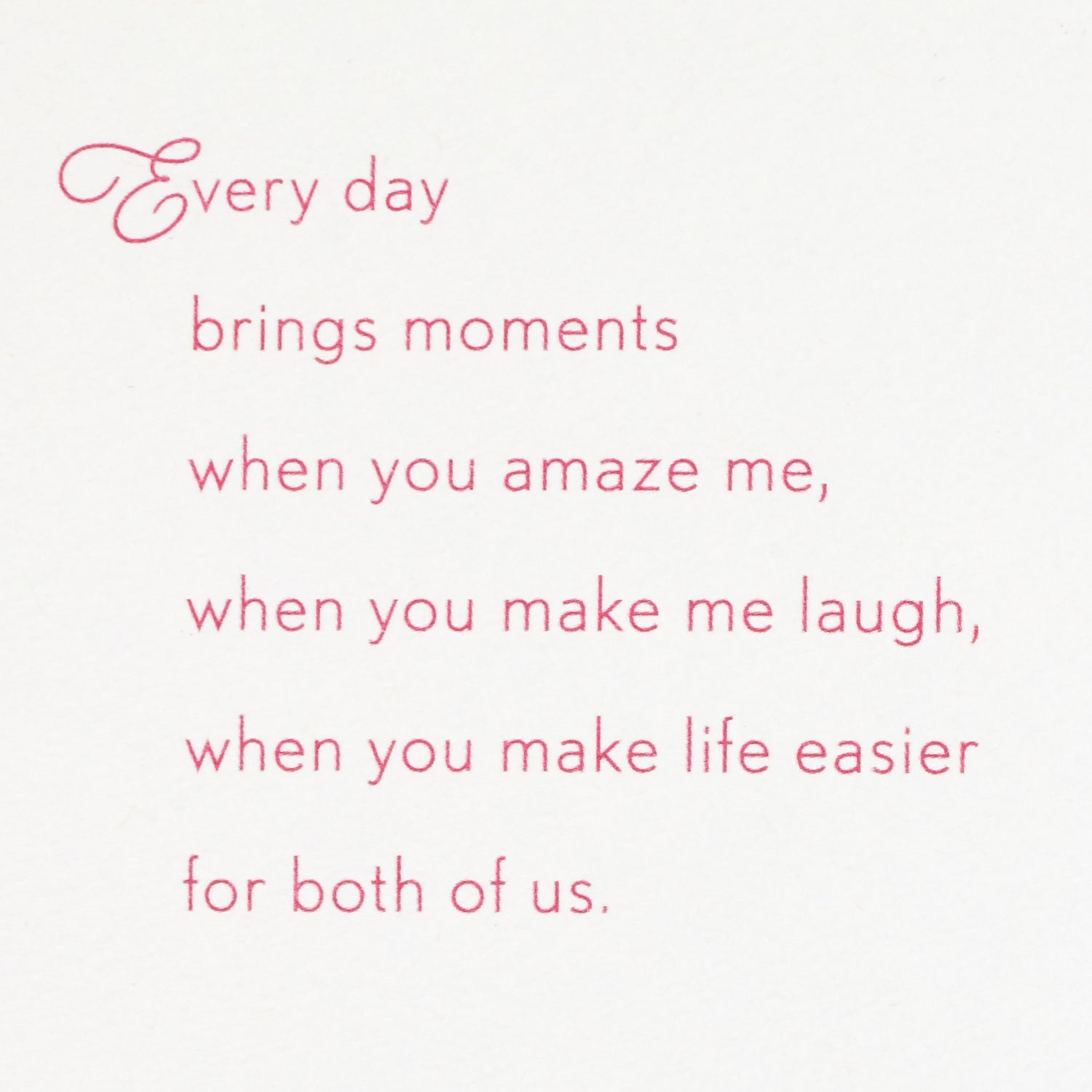 Inside reads: "Every day brings moments when you amaze me, when you make me laugh, when you make life easier for both of us. All those moments make me feel even closer to you, even happier, and even luckier to have you and your love. I love you."