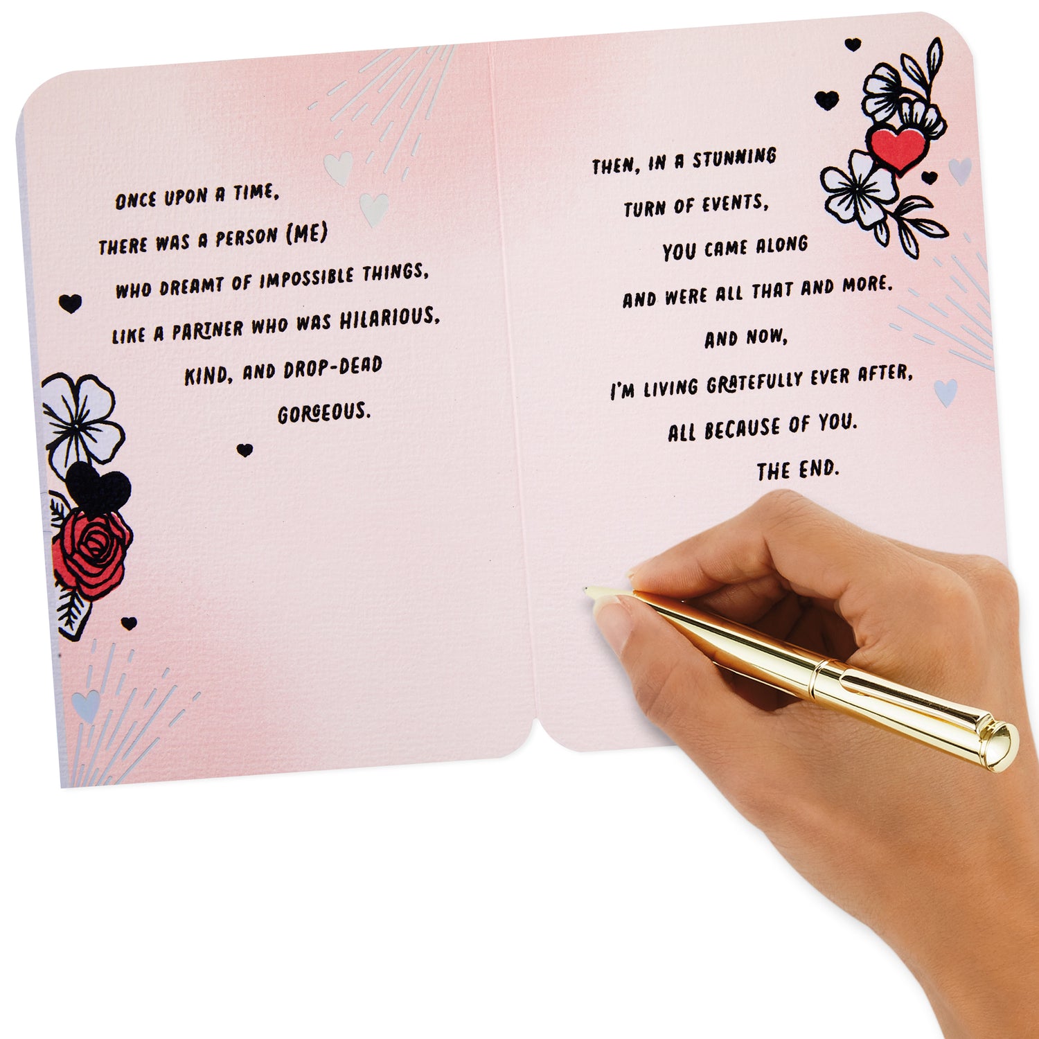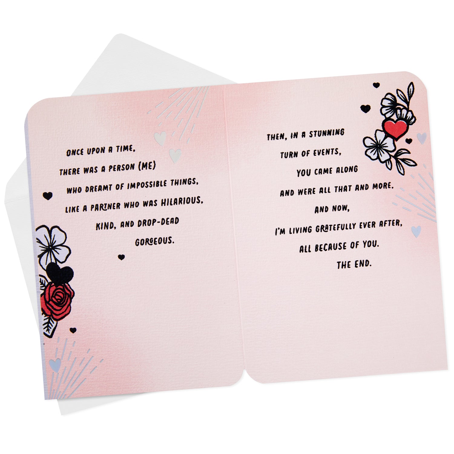 Inside reads: "Once upon a time, there was a person (me) who dreamt of impossible things, like a partner who was hilarious, kind, and drop-dead gorgeous. Then, in a stunning turn of events, you came along and were all that and more. And now, I'm living gratefully ever after, all because of you. The end."