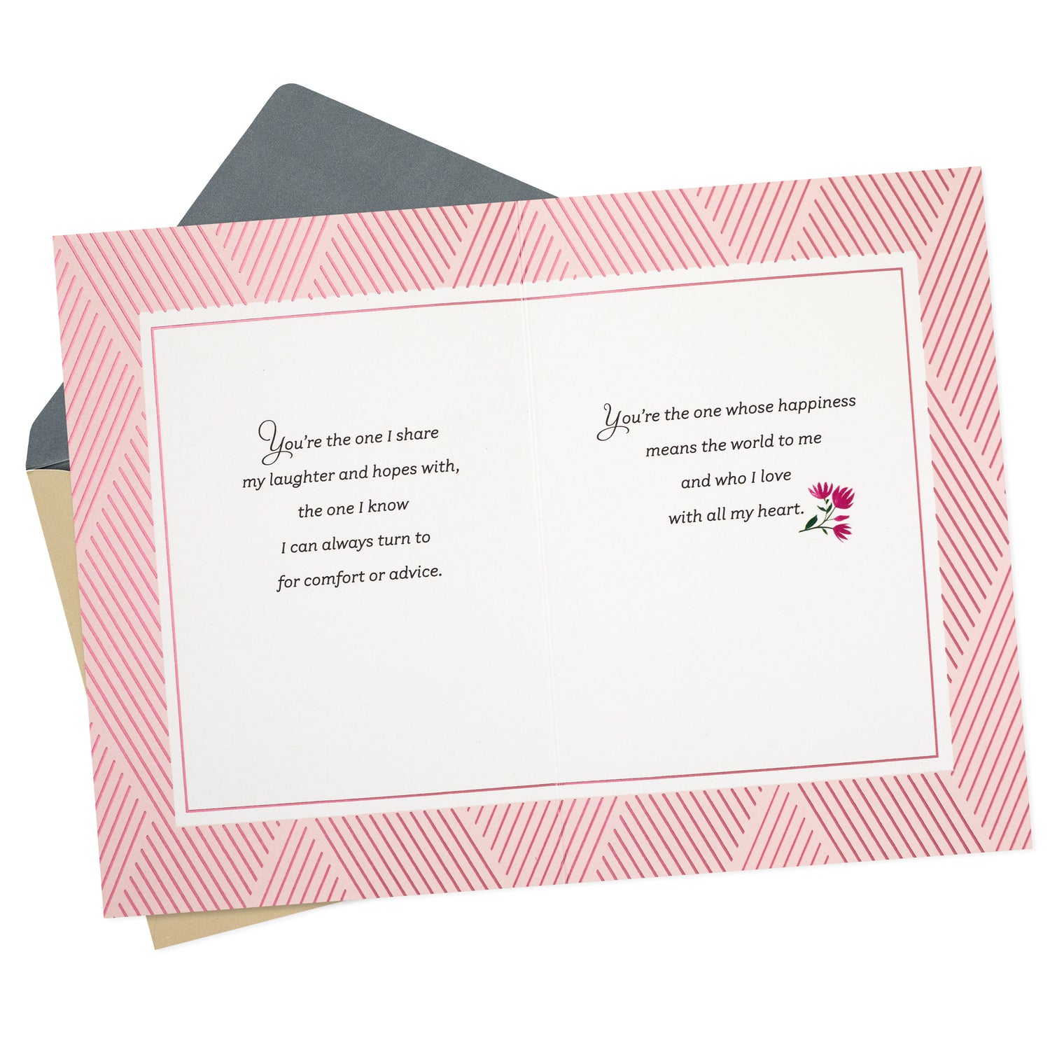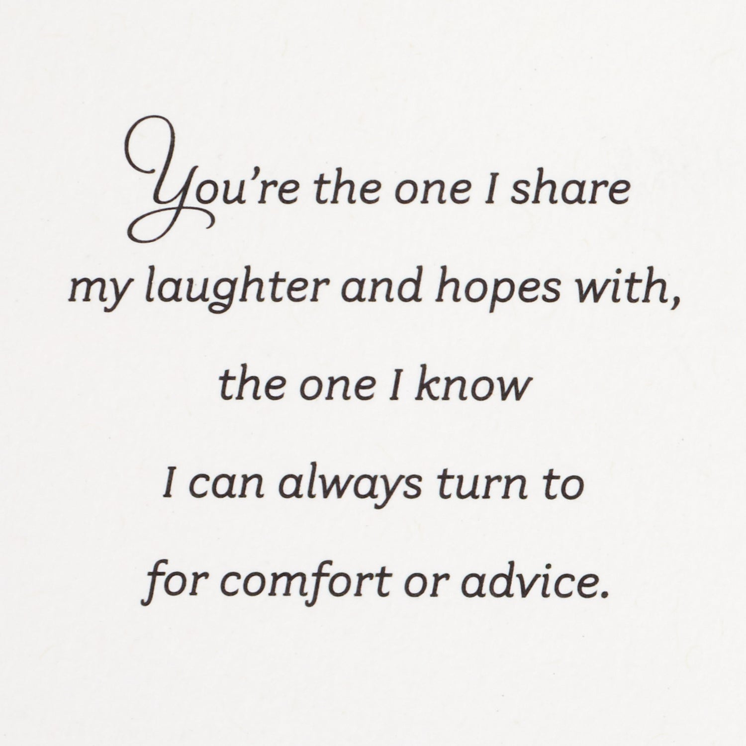 Inside reads: "You're the one I share my laughter and hopes with, the one I know I can always turn to for comfort or advice. You're the one whose happiness means the world to me and who I love with all my heart."