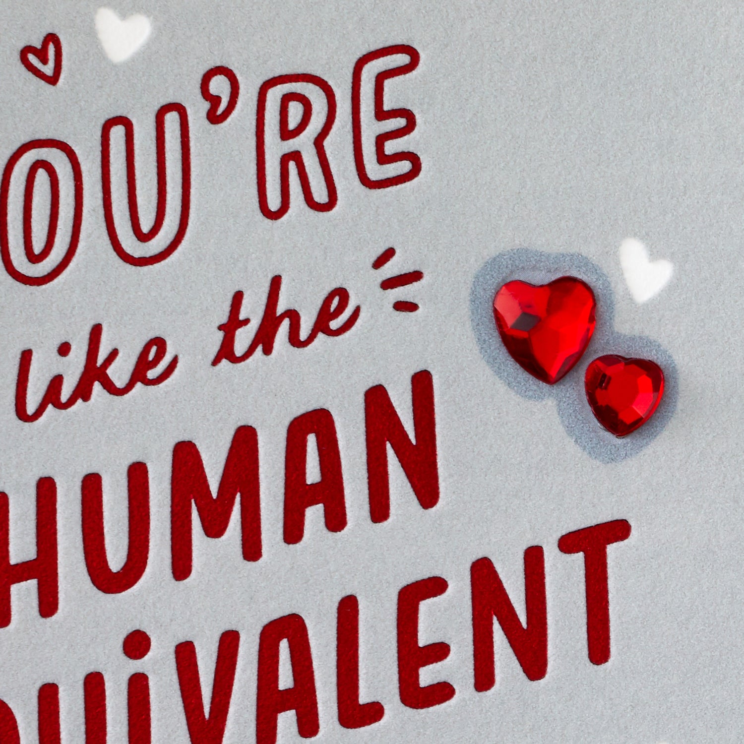 Cover features red foil lettering on a gray background, embellished with gemstone hearts, that reads: "You're like the human equivalent of a weighted blanket."