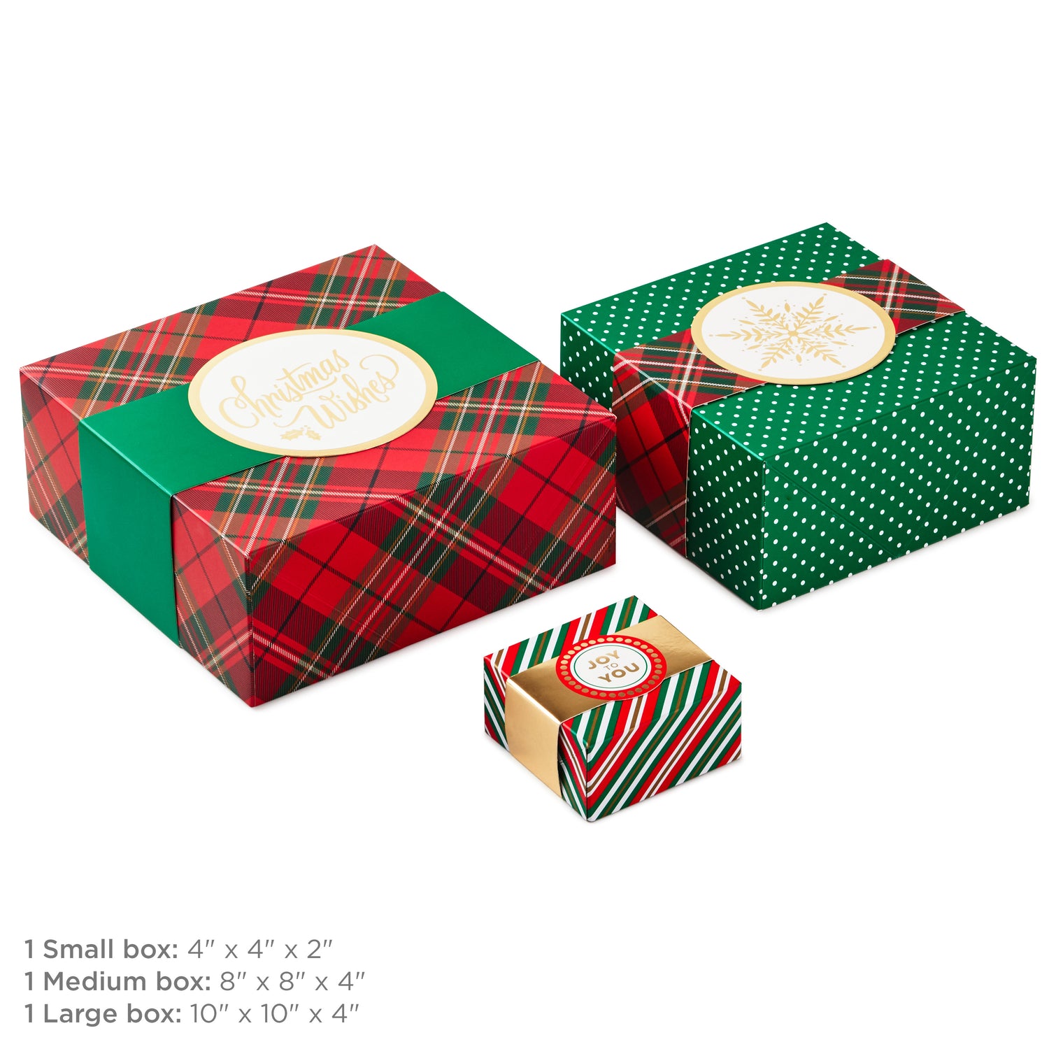 COORDINATING DESIGNS: Set of assorted gift boxes features 3 holiday designs with decorative wrap bands: Red, white and green diagonal stripes with "Joy to You" lettering, green with white dots and gold snowflake, red plaid with "Christmas Wishes"