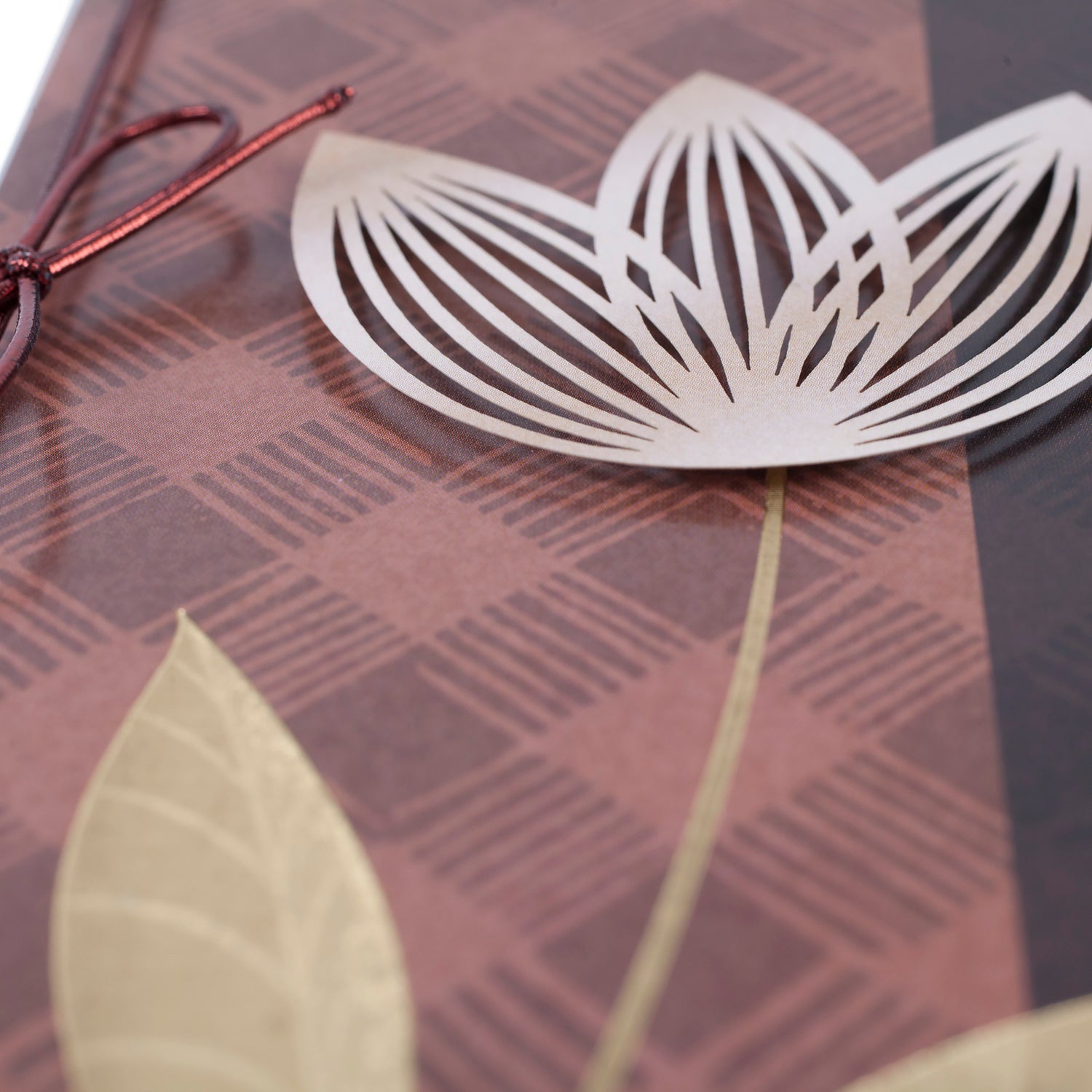 B-day card features plaid pattern, gold foil, laser-cut flower and elastic ribbon.