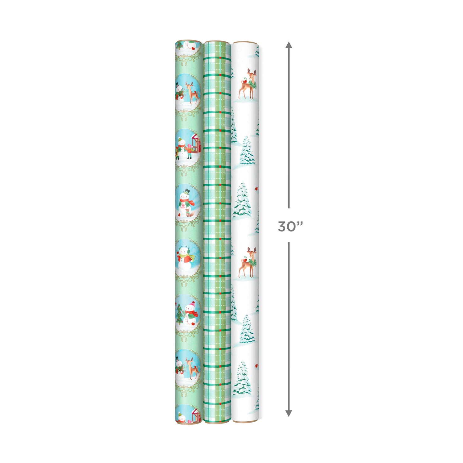 THREE CHARMING DESIGNS: Set of coordinated holiday gift wrap features charming snowmen, pretty green plaid and sweet storybook critters, like deer, cardinals and foxes, in a snowy woodland scene.