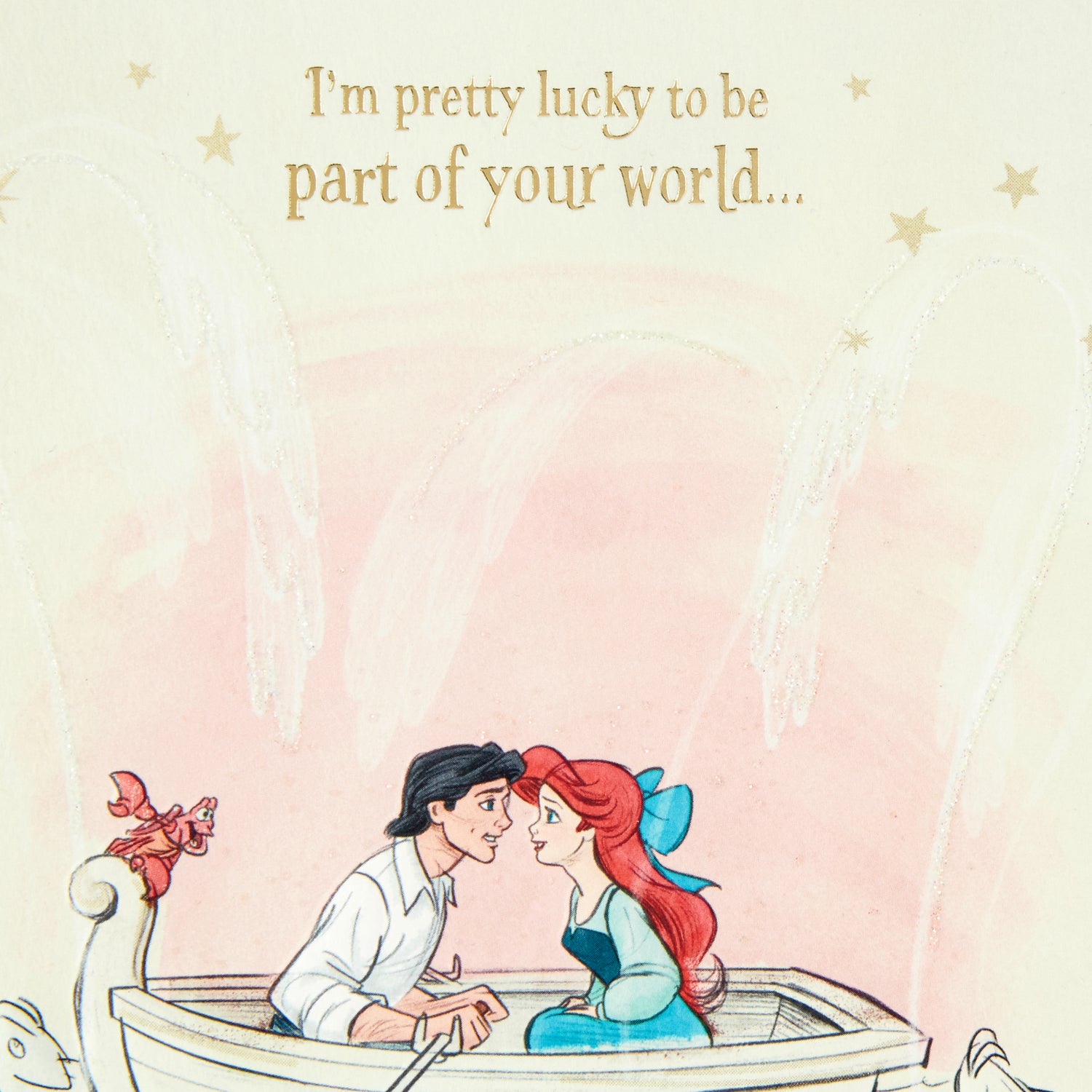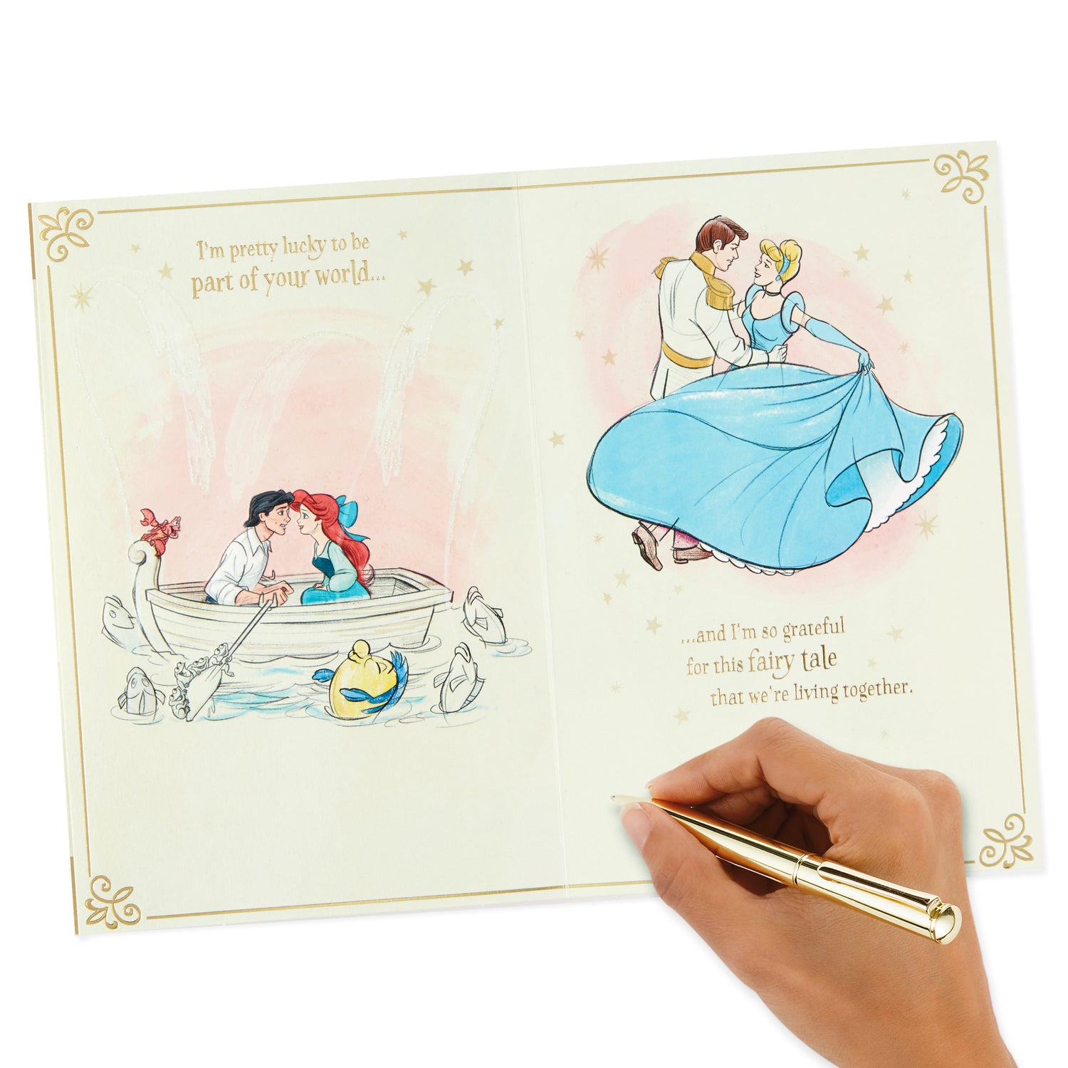 Featuring a sweet storybook design featuring couples like Belle and the Beast, Ariel and Eric, Rapunzel and Flynn, and Jasmine and Aladdin, and a warm sentiment inside, this card is the perfect way to express your love to your husband, wife, boyfriend, girlfriend, or any other romantic partner.