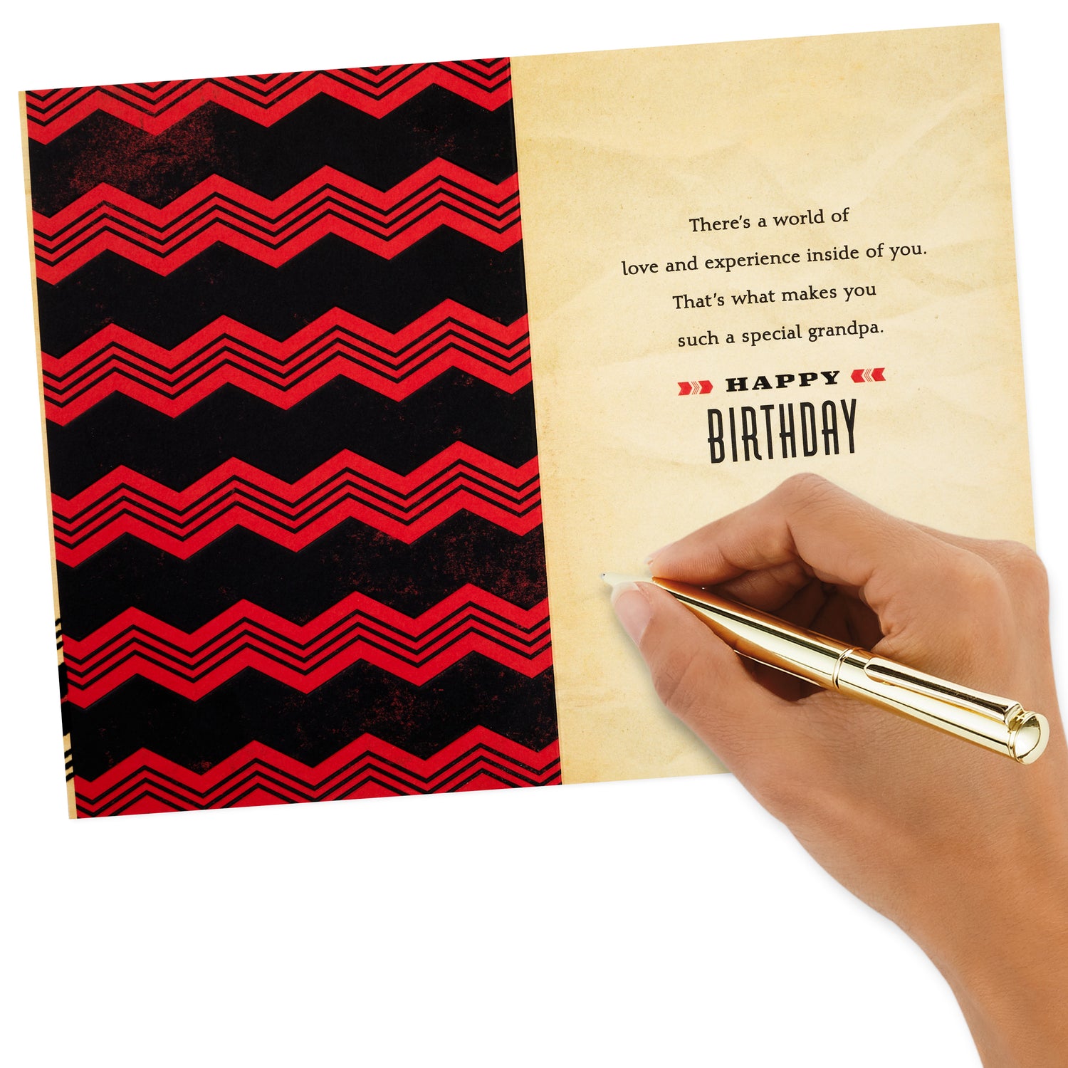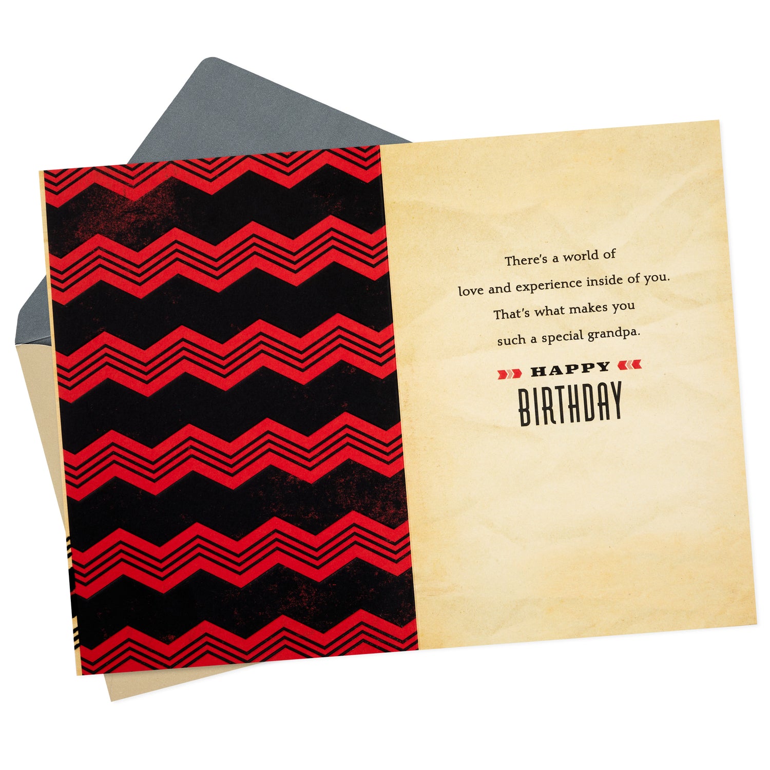 Inside reads: "There's a world of love and experience inside of you. That's what makes you such a special grandpa. Happy birthday."