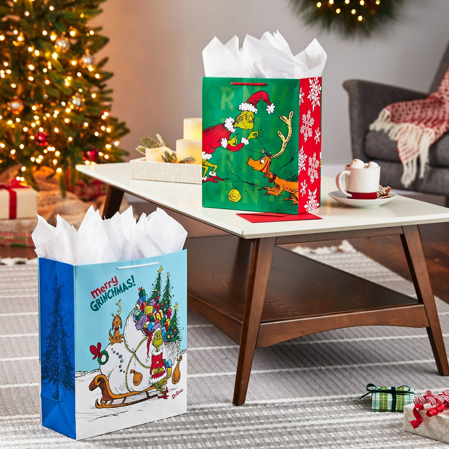 Hallmark Dr. Seuss Grinch Gift Bag Set for Kids (2 Bags: 1 Large 13", 1 Extra Large 15") The Grinch with Max and Sleigh