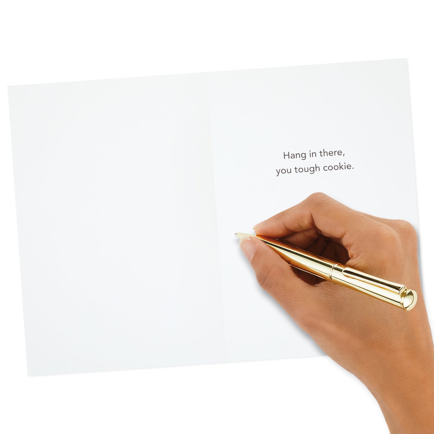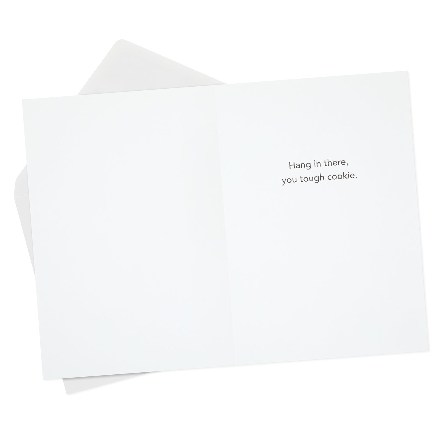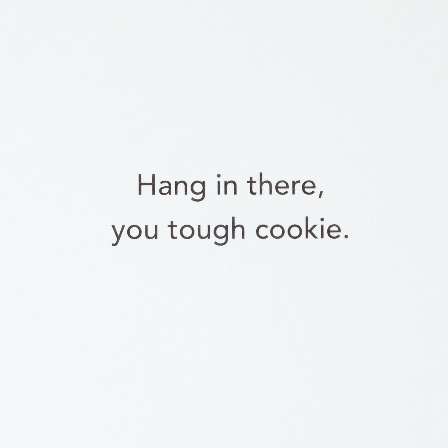 Cover features a stack of chocolate chip cookies on a blue background. Inside reads: "Hang in there, you tough cookie."