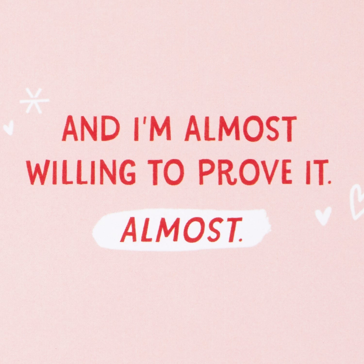 Inside reads: "And I'm almost willing to prove it. Almost."