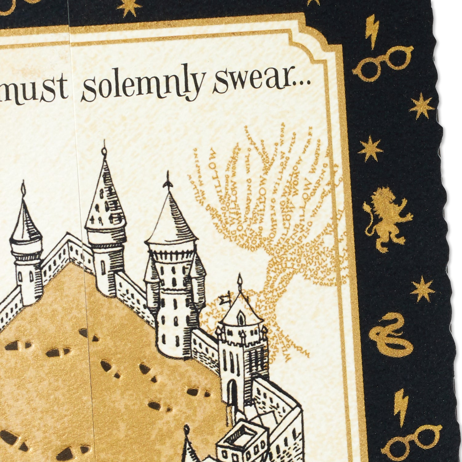 Cover features a Marauder's Map design accented with glitter and gold foil. Message reads: "You must solemnly swear . . ."