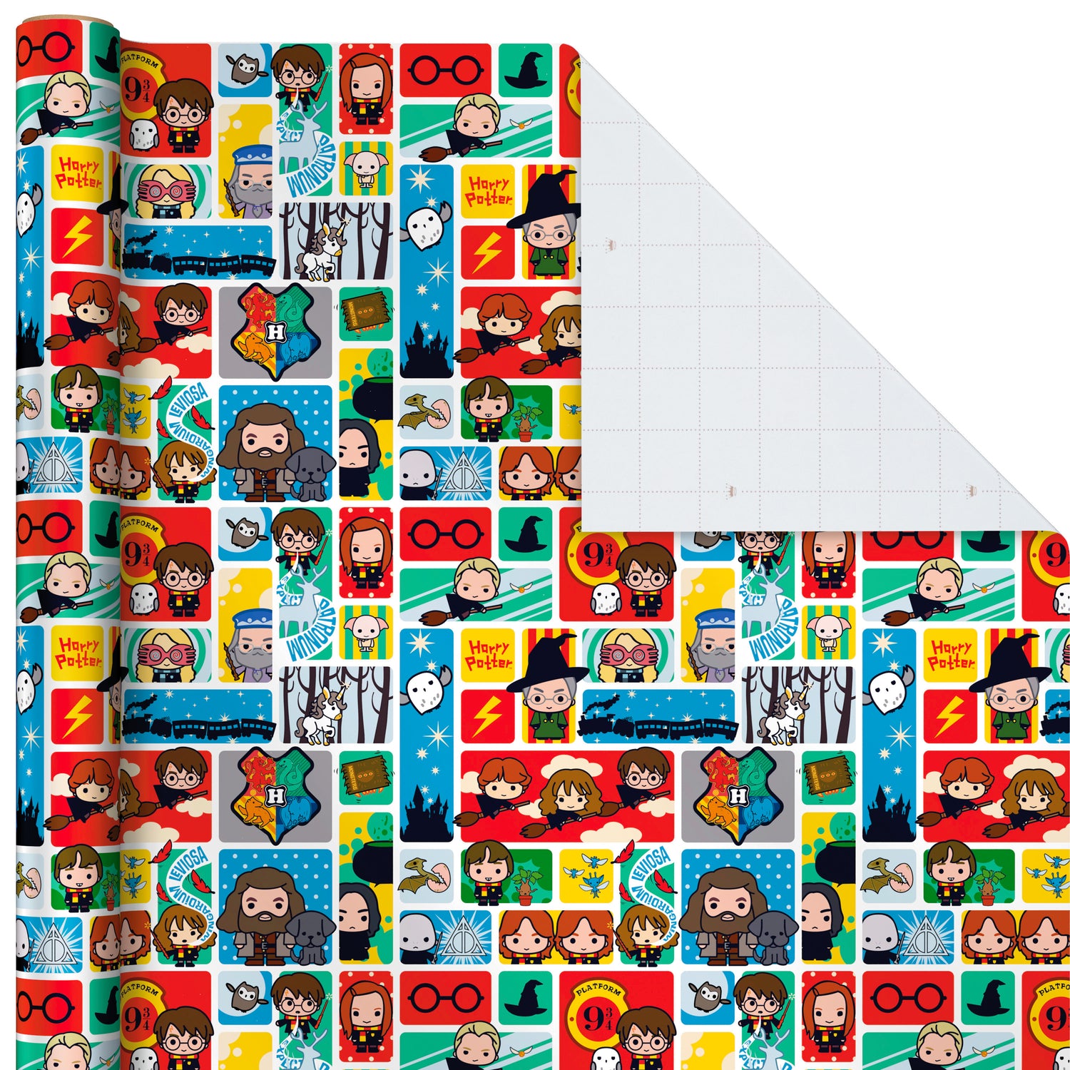 THREE FUN DESIGNS: Bundle of gift wrap features iconic Harry Potter images like Hogwarts house crests on white, Marauder's Map, and colorful cartoon illustrations of Harry, Hermione, Ron, Hagrid, Professor Snape and more.
