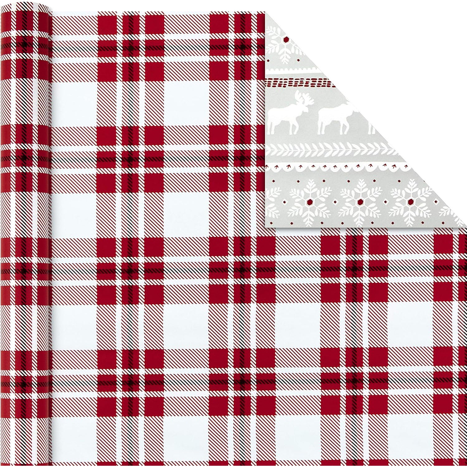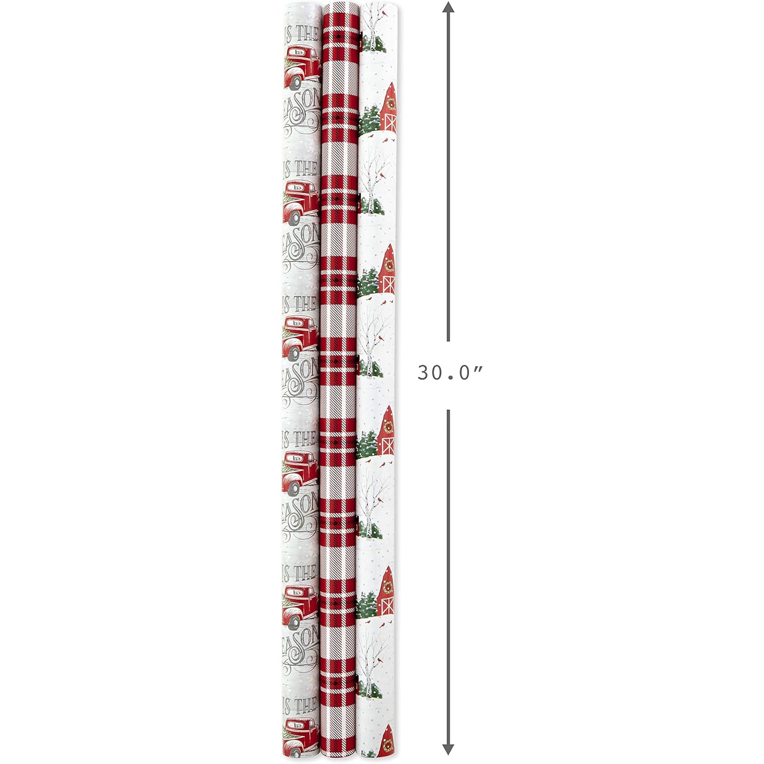 Hallmark Holiday Reversible Wrapping Paper Bundle, Rustic Christmas (Pack of 3, 120 sq. ft. ttl) Plaid, Barn, Red Truck, Moose, Woodland Scenes
