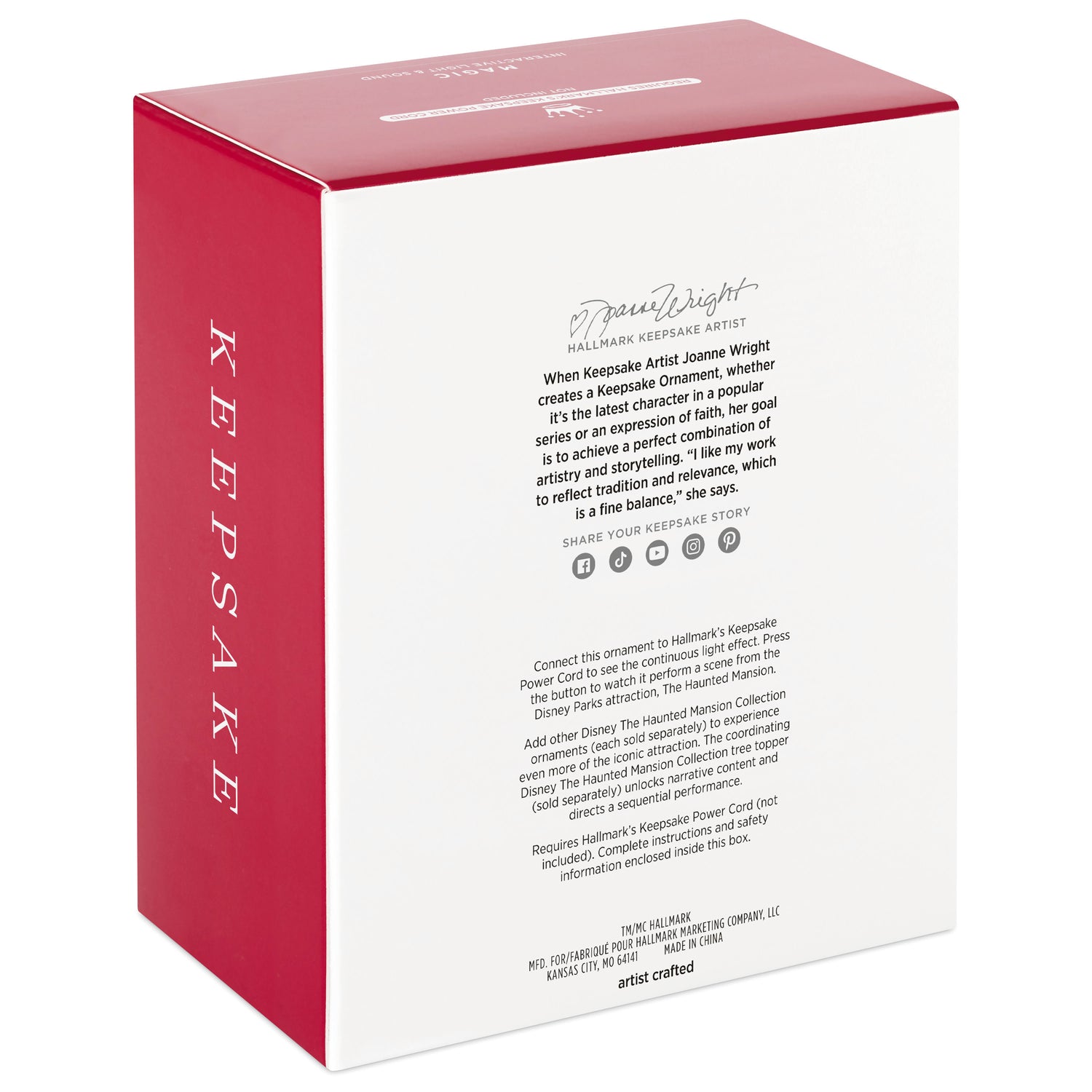 Connect the Interactive Light and Sound ornament to Hallmark's Keepsake Power Cord (sold separately) to see a continuous light effect. Press the button to watch it perform a scene. Add other Disney The Haunted Mansion Collection ornaments (each sold separately) to experience even more of the iconic attraction. The coordinating Disney The Haunted Mansion Collection tree topper (sold separately) unlocks narrative content and directs a sequential performance. Ornament plays music, dialogue and sound effects from the Disney Parks attraction The Haunted Mansion.