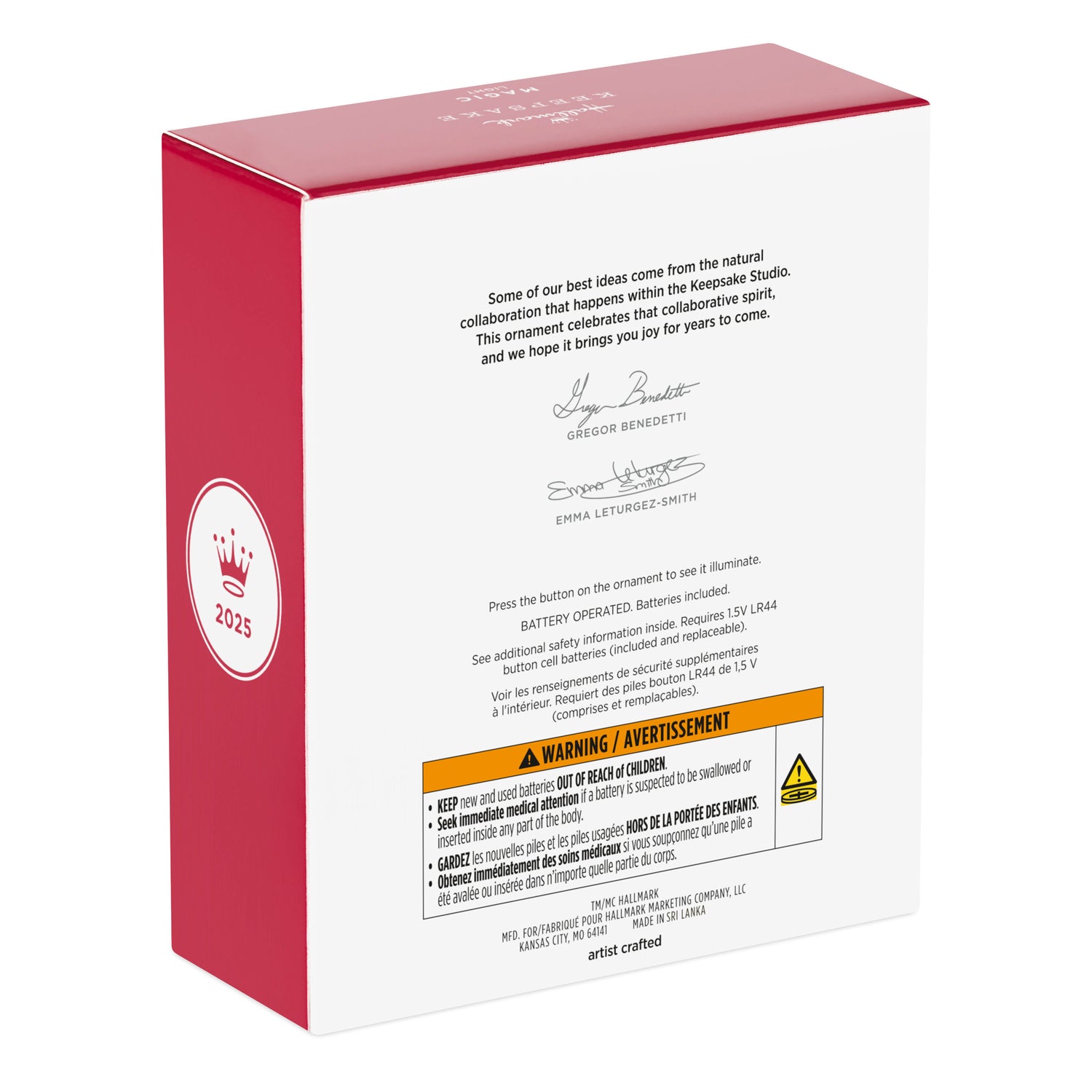 Includes: One 2025 Keepsake Ornament in gift box. Requires three (3) alkaline LR44 replaceable button batteries (included).