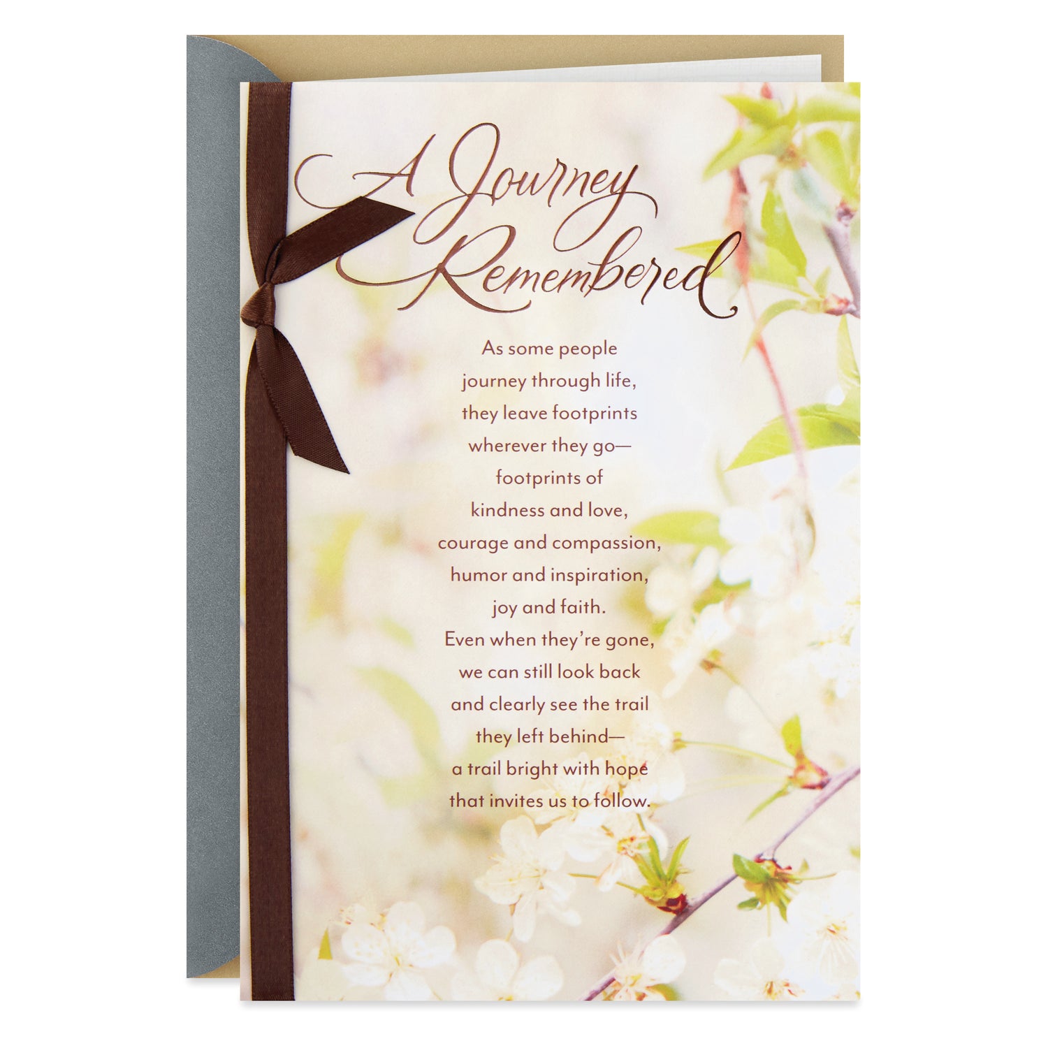 The message on the front of the card reads, "A journey remembered As some people journey through life, they leave footprints wherever they go—footprints of kindness and love, courage and compassion, humor and inspiration, joy and faith.
