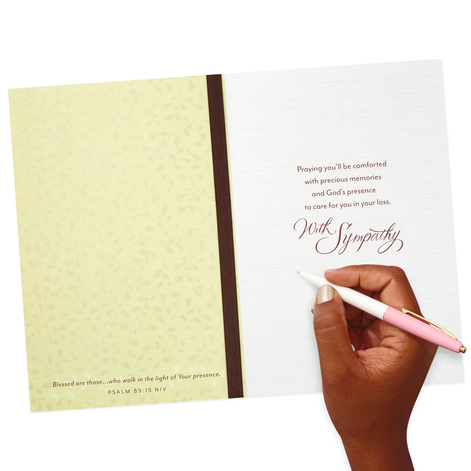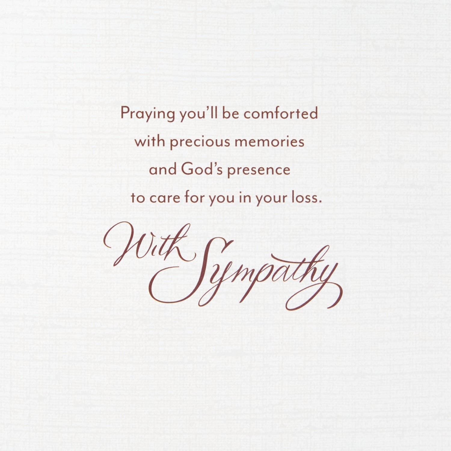 Even when they're gone, we can still look back and clearly see the trail they left behind—a trail bright with hope that invites us to follow." Open the card to reveal the inside message, "Praying you'll be comforted with precious memories and God's presence to care for you in your loss.