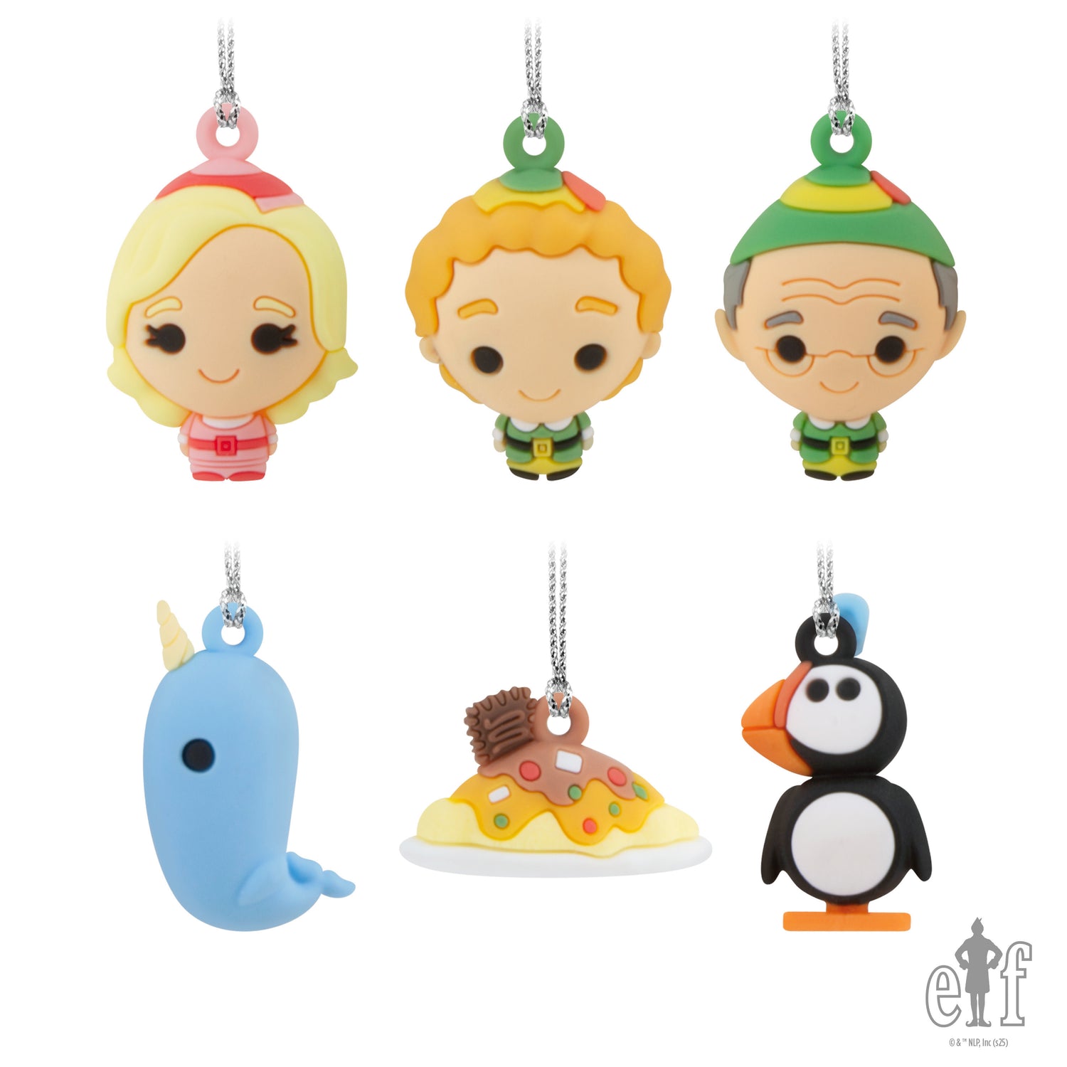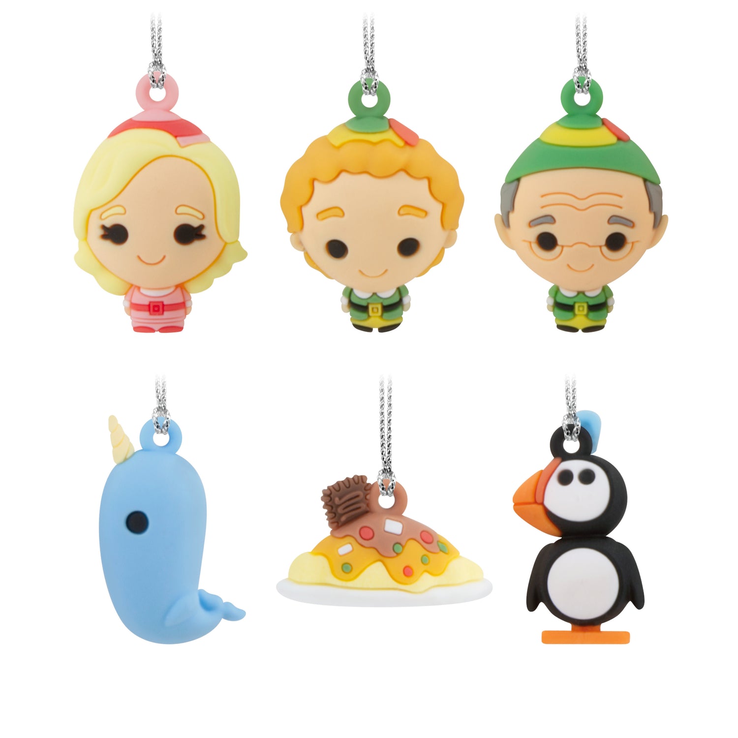 Spread Christmas cheer with this set of 6 miniature Hallmark Christmas ornaments from the movie "Elf." Includes Buddy the Elf, Papa Elf, Jovie, narwhal, penguin and a plate of spaghetti.