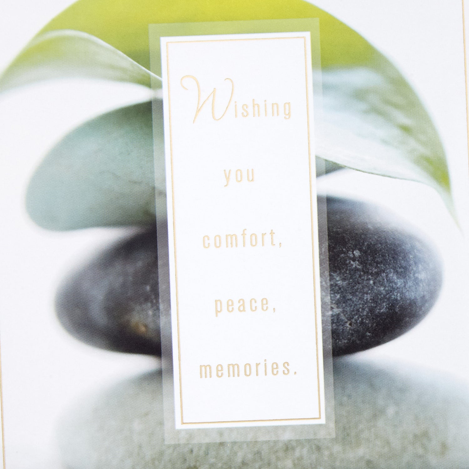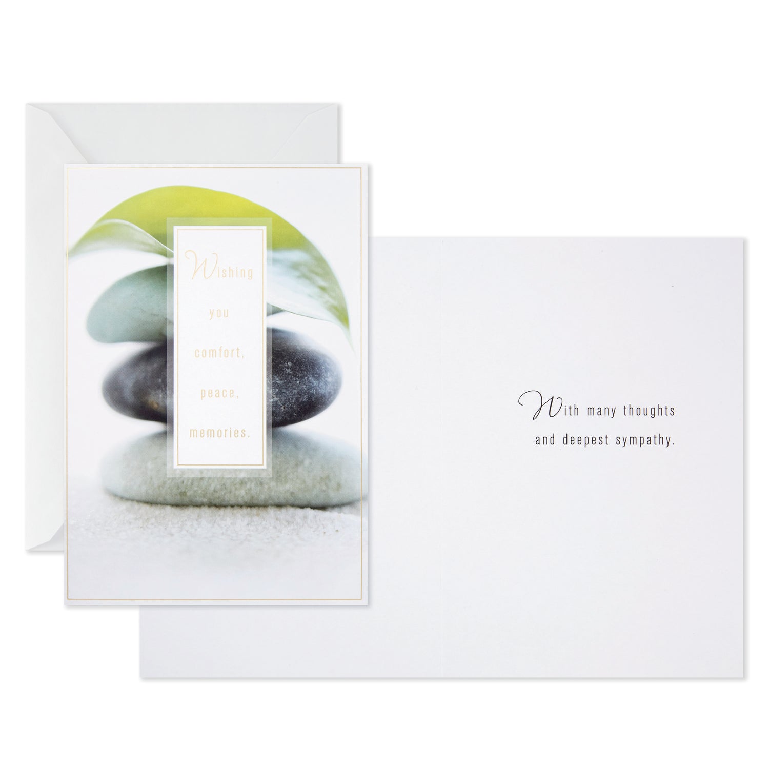 Stacked rocks with leaf design: Wishing you comfort, peace, memories.; With many thoughts and deepest sympathy.