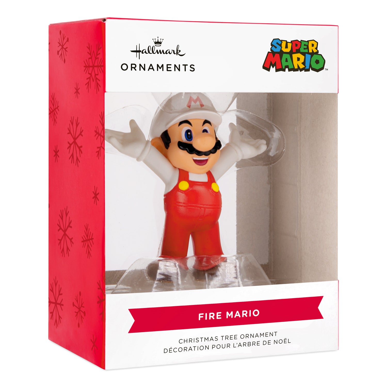 Delight a "Super Mario Bros." fan with this Fire Mario Hallmark Christmas ornament. Power up the holiday fun with the character in his Fire Mario form with red overalls.