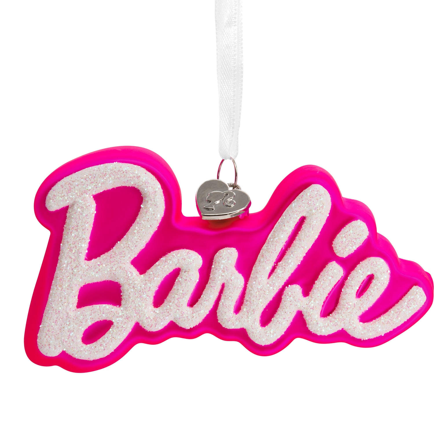 Delight a Barbie fan with this fun blown glass Hallmark Christmas ornament featuring the iconic logo with glittery white lettering on a pink background with a silver-tone charm.