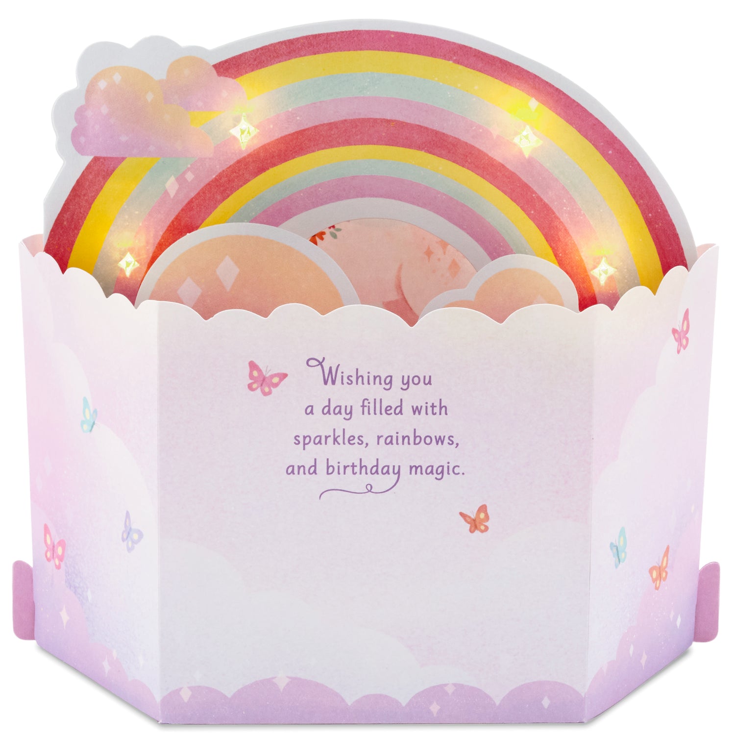 Card arrives flat and can be popped up into a three dimensional diorama of a unicorn standing in pink clouds with a rainbow in the background. Press the button to hear music. Card reads: "Happy birthday. Wishing you a day filled with sparkles, rainbows, and birthday magic."