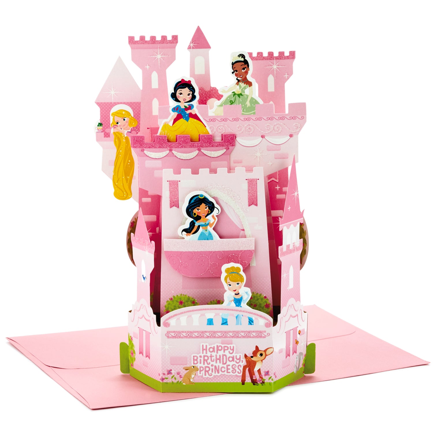 Card arrives flat and can be popped up into a three dimensional diorama of a castle filled with Disney princesses. Card reads: "Happy birthday, princess! May all your dreams come true."