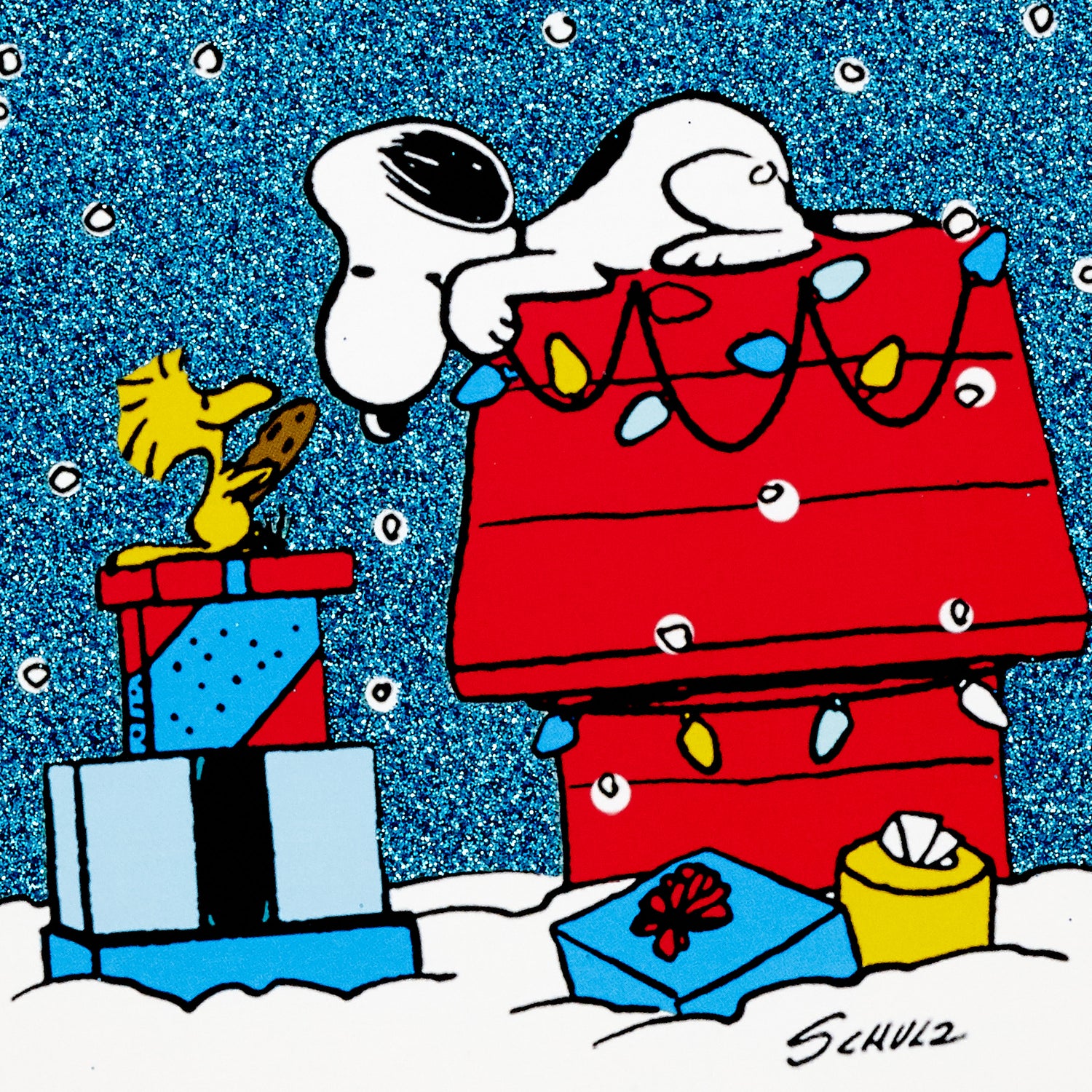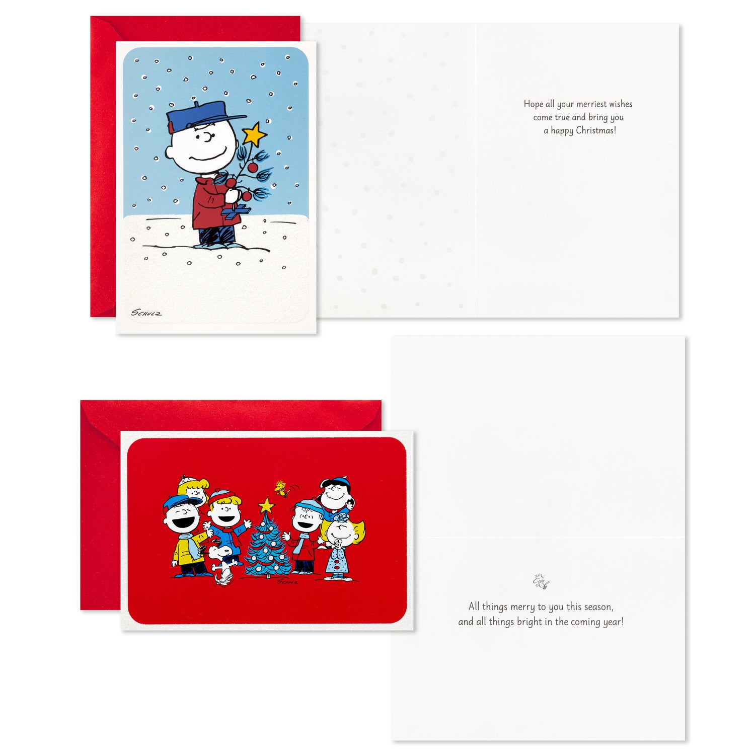 Includes 4 glitter accented holiday card designs (4 of each design) featuring classic winter Peanuts scenes with your favorite characters. Unique sentiments inside each design.