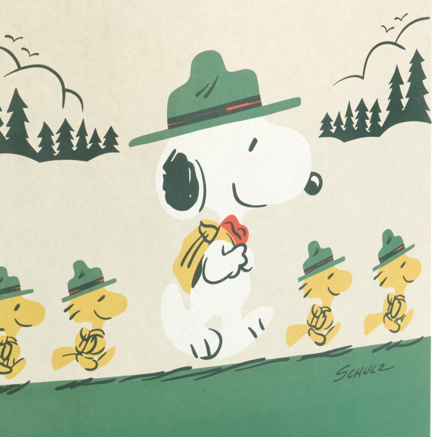 FUN AND FESTIVE: Pair of fun gift bags feature Snoopy and his yellow bird friends hiking in the woods, roasting marshmallows over a campfire and paddling in a canoe; cord handles complete the look