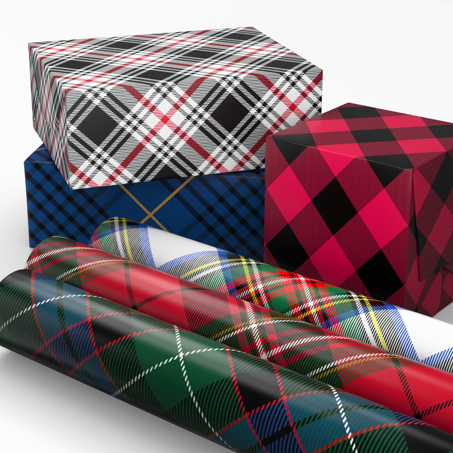 HANDSOME DESIGNS: Bundle of plaid wrapping paper rolls include a variety of tartan and buffalo plaid designs in red, black, blue, green and white; great for Christmas, Father's Day, graduations, birthdays and other celebrations