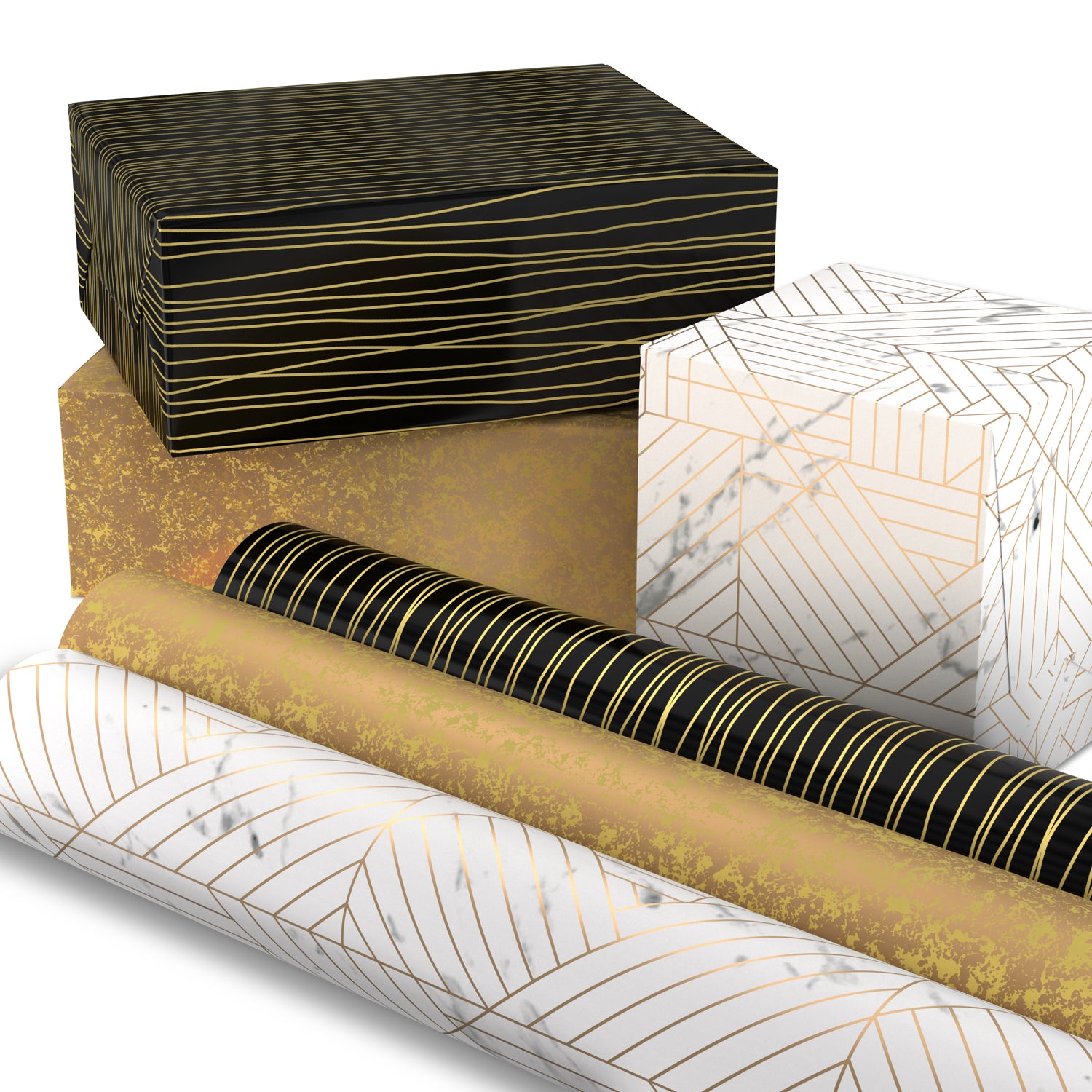 Hallmark Premium Wrapping Paper Bundle with Cut Lines on Reverse - Marble, Sparkly Black, & Antiqued Marigold (3-Pack: 85 sq. ft. ttl.) for Birthdays, Weddings, Graduations & Valentine's Day
