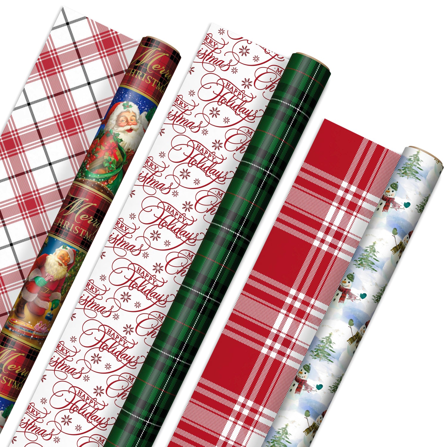 SIX FESTIVE DESIGNS: Bundle of reversible holiday wrapping paper features 6 designs: Vintage Santa Claus on red plaid/red, black and white plaid; Green plaid/red "Happy Holidays! Merry Christmas!" on white; Classic snowmen/red and white plaid.