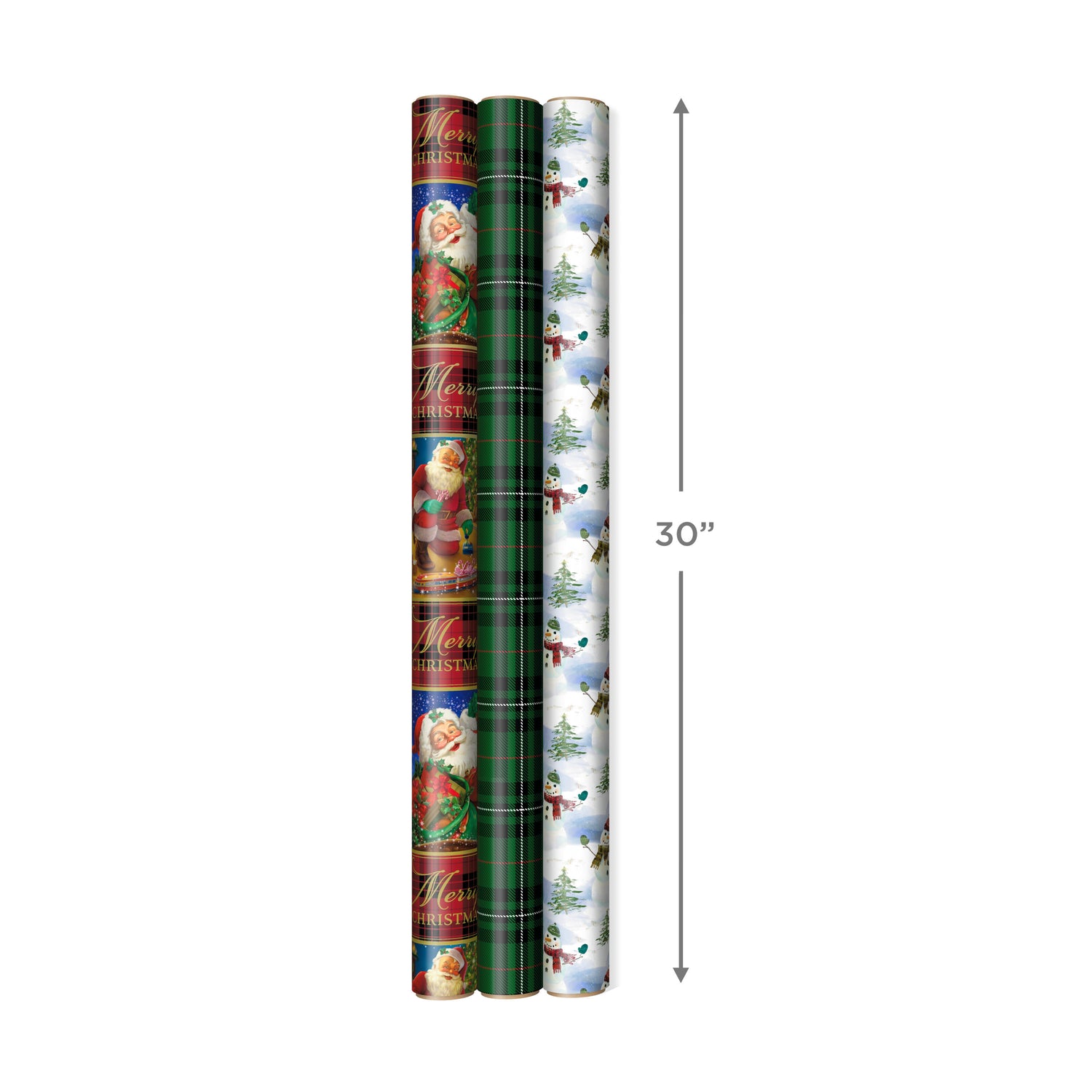 Reversible Christmas Wrapping Paper (3 Rolls: 120 sq. ft. ttl) Vintage Santa, Snowmen, Traditional Green, Red and White Plaids