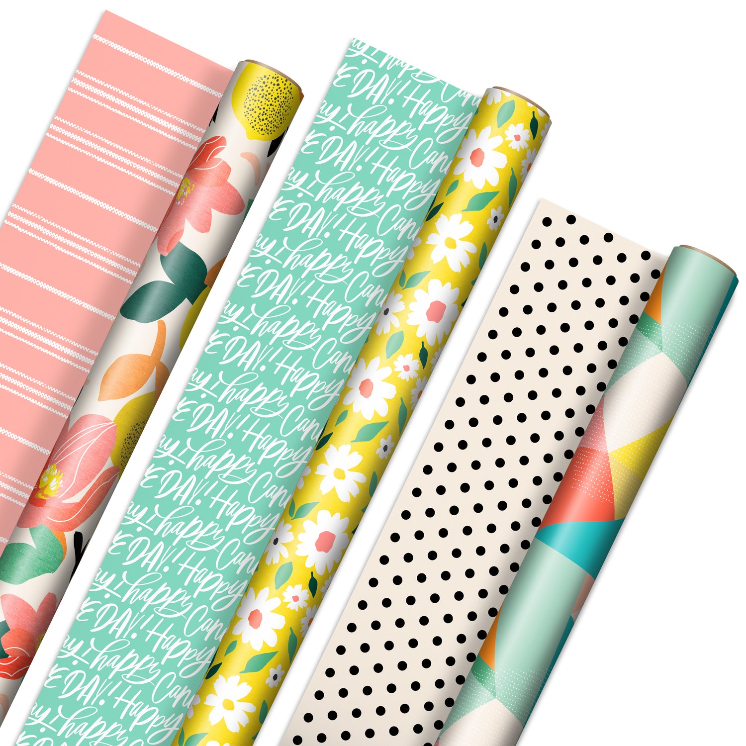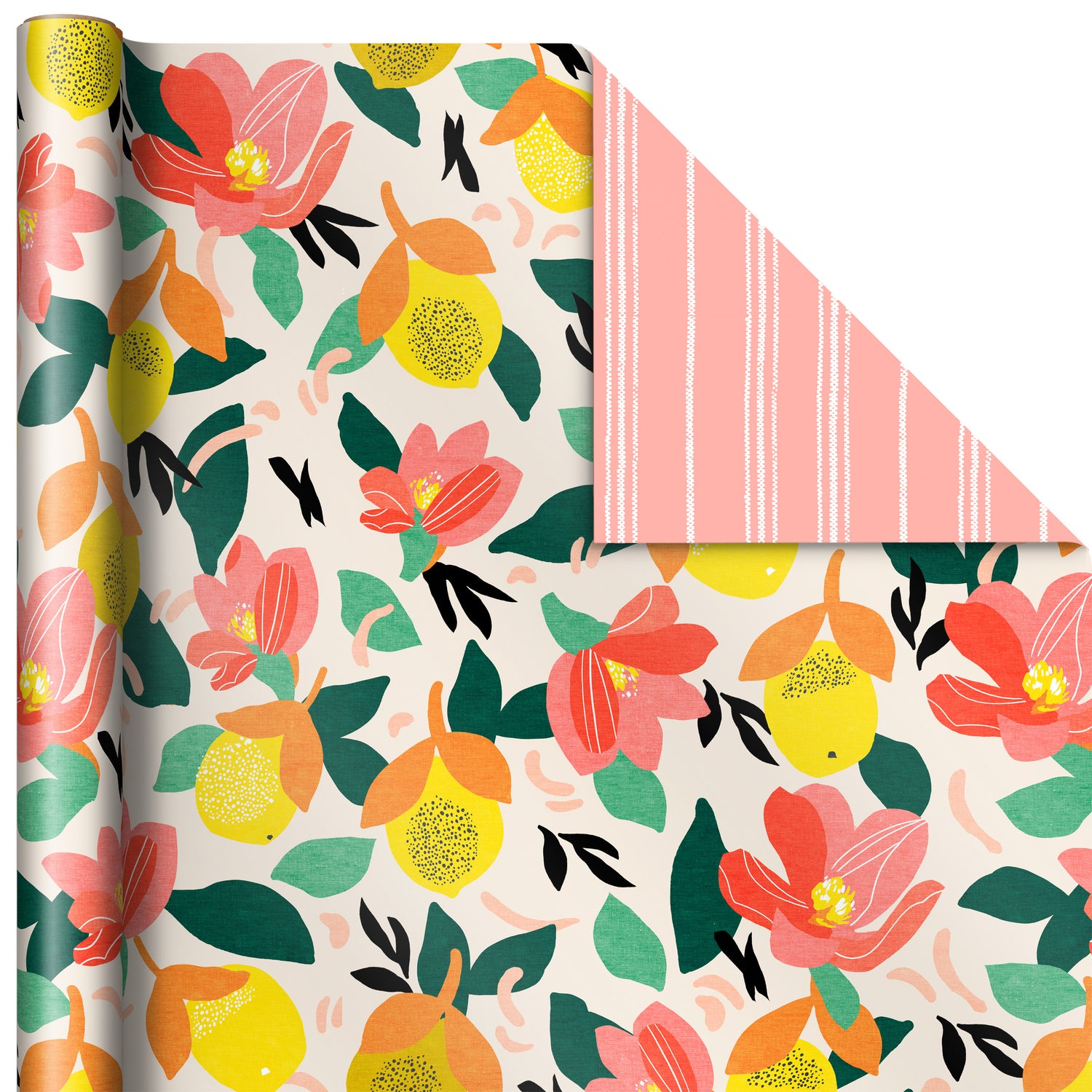 Hallmark Reversible Wrapping Paper (3 Rolls: 75 Sq. Ft. Ttl) Floral, Lemons, Bright Abstract for Birthdays, Easter, Mother's Day, Bridal Showers, Baby Showers