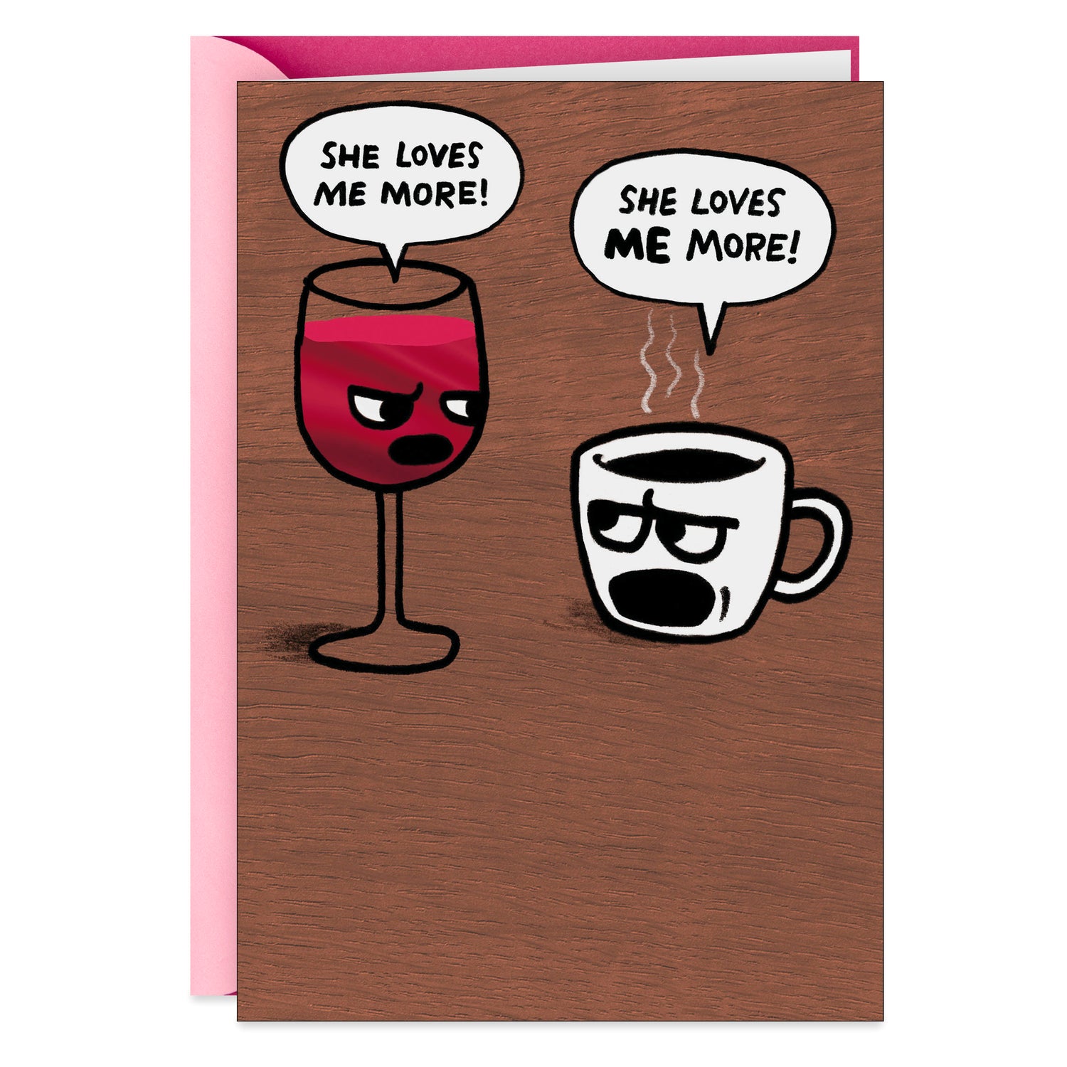 Front features an illustration of a glass of wine and a mug of coffee on a coffee table arguing about who she loves more. Inside reads: "Hope you feel the love on your birthday."