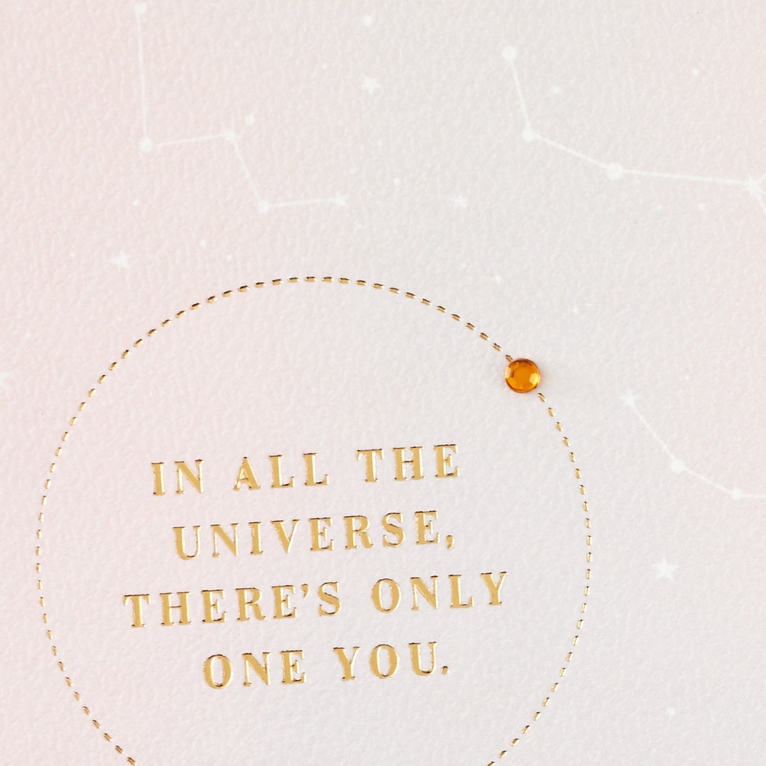 Cover features a pretty constellation design on a pink sky background, accented with foil and a gemstone. Message reads: "In all the universe, there's only one you."