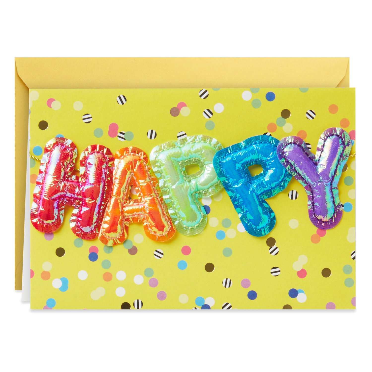 Birthday card features shiny puffy letters and a cheerful confetti design.