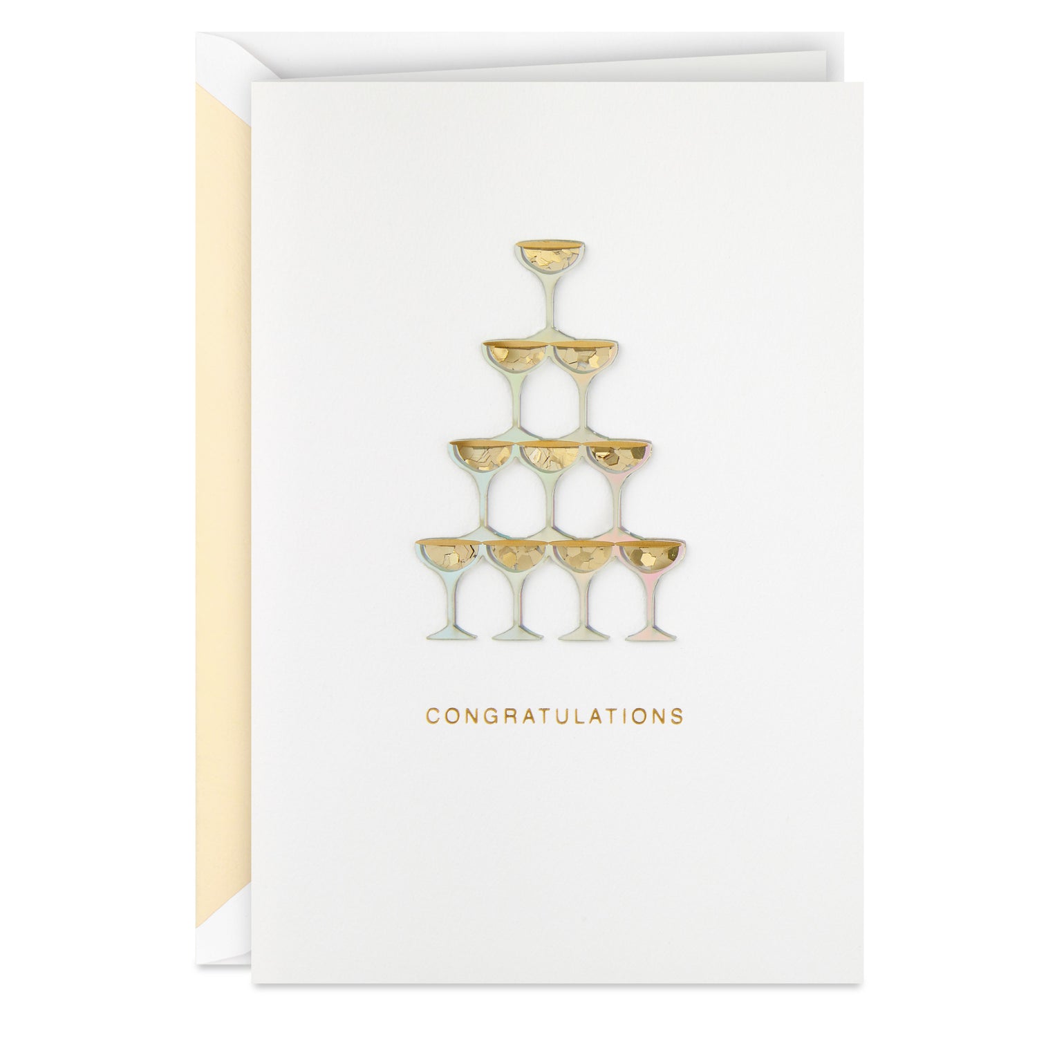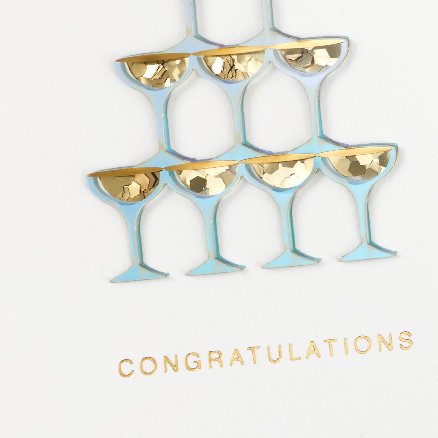 Cover features a tower of champagne coupes, embellished with gold sequins. Message reads: "Congratulations." Inside reads: "Cheers to a lifetime of happiness."