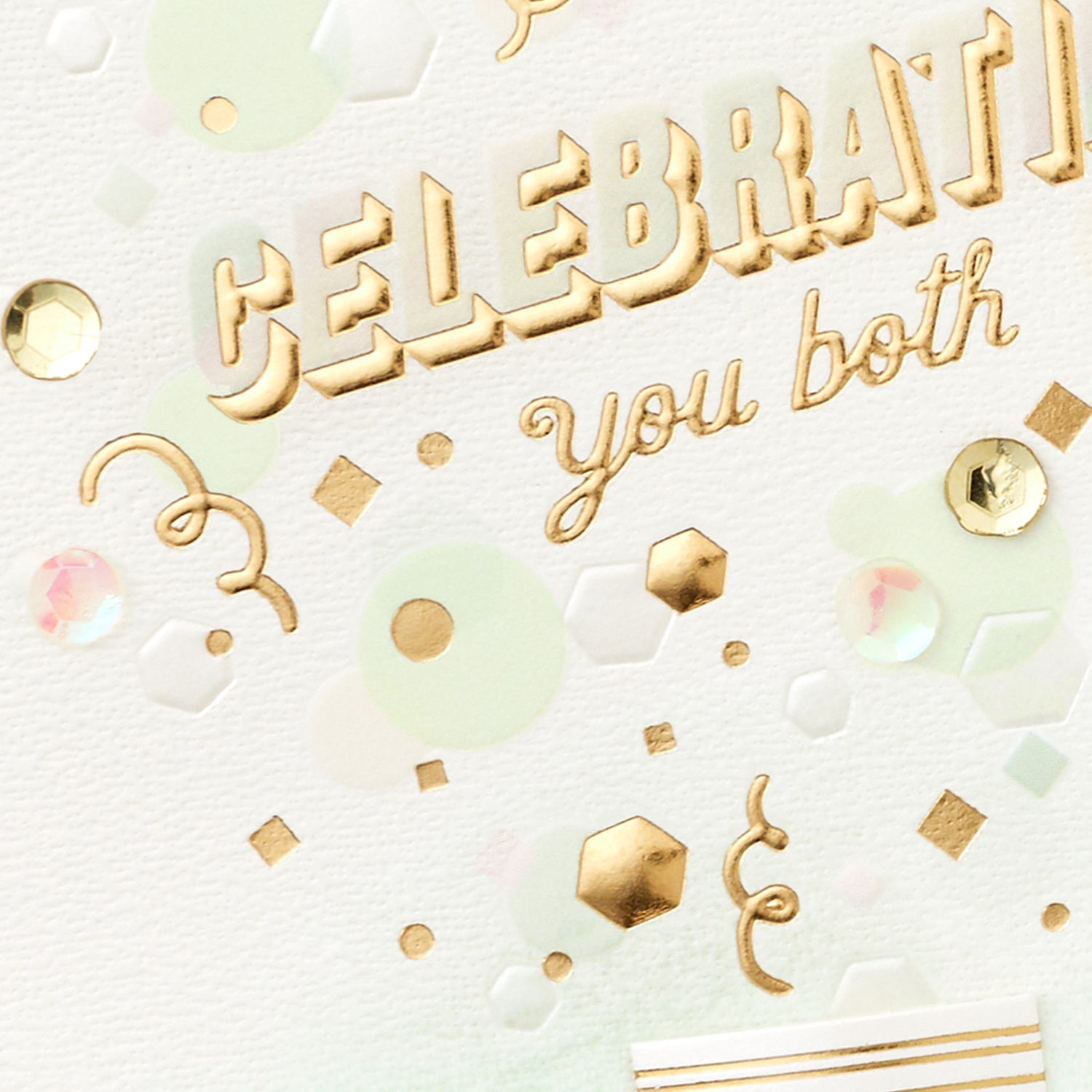 Cover features a party popper shooting out confetti, accented with sequins and gold foil. Message reads: "Celebrating you both." Inside reads: "Celebrating your love."