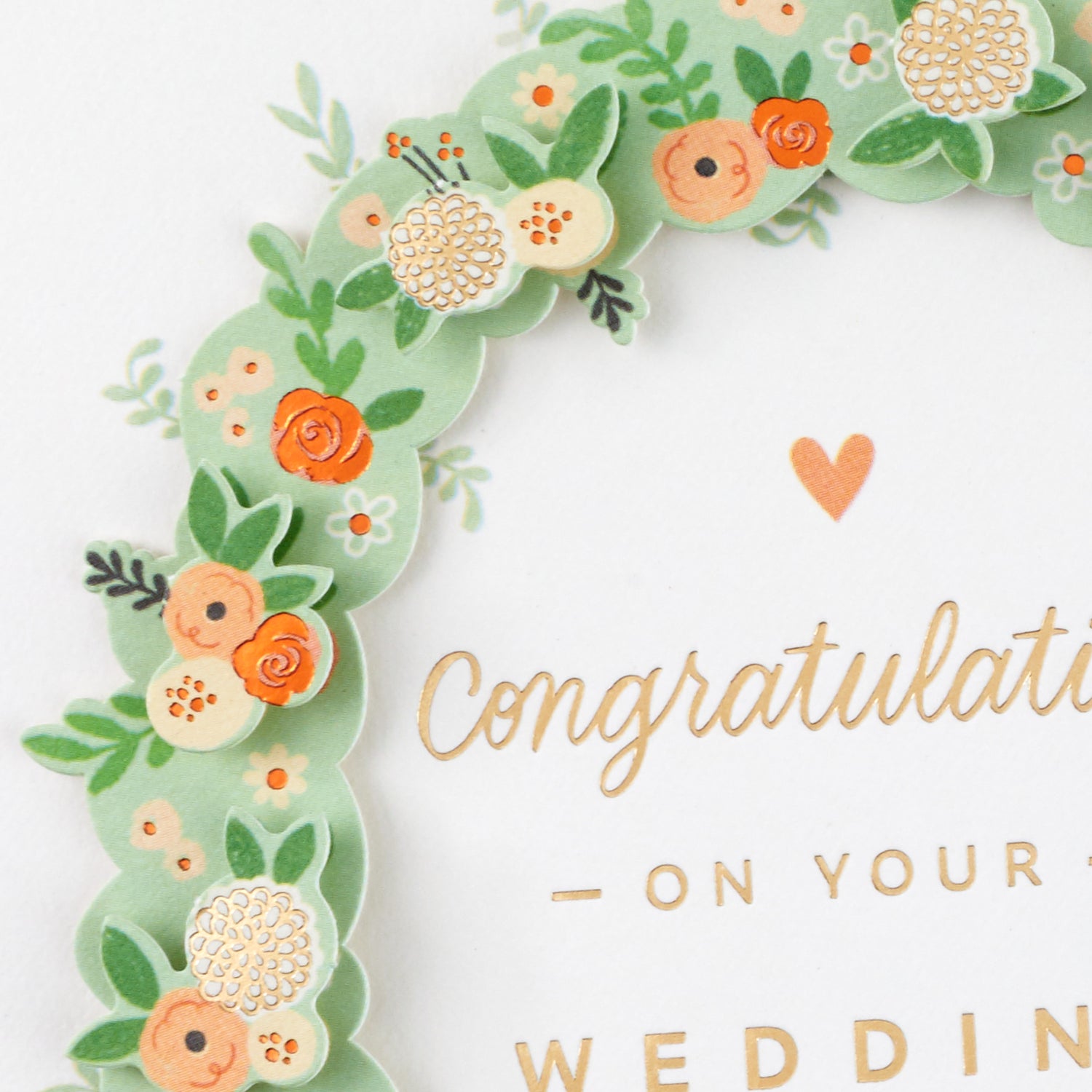 Cover features a floral arch design embellished with paper attachments and metallic foil. Message reads: "Congratulations on your wedding." Card is blank inside.