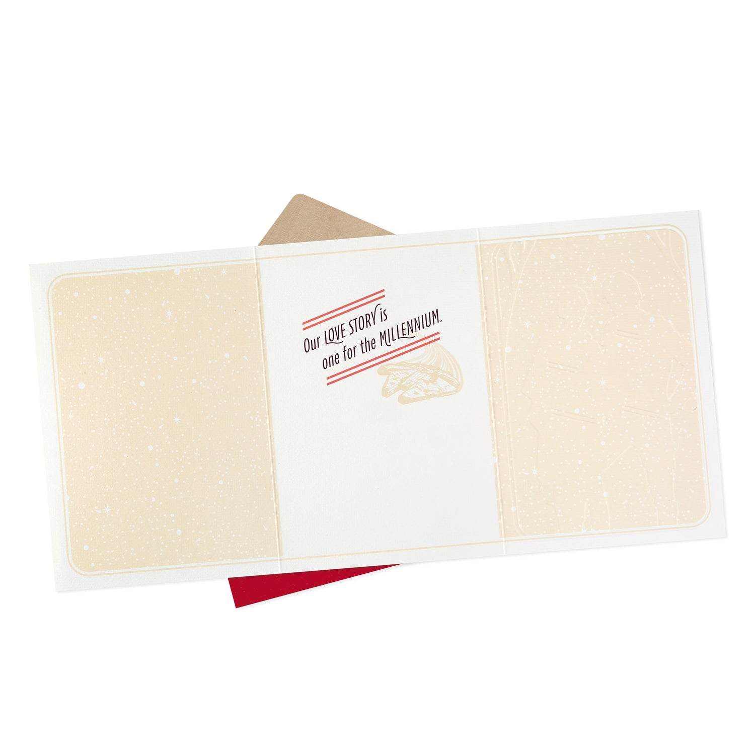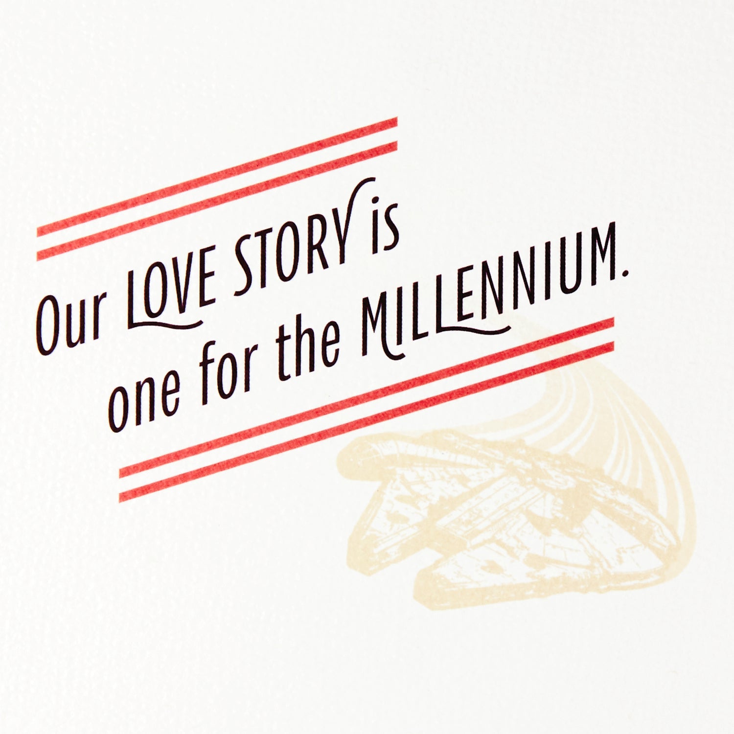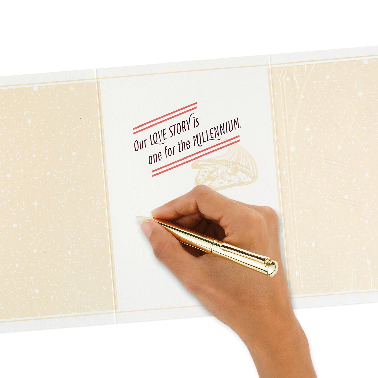 Cover features a Han Solo, Princess Leia, and the Millennium Falcon design, accented with gold foil lettering. Inside reads: "Our love story is one for the millennium."