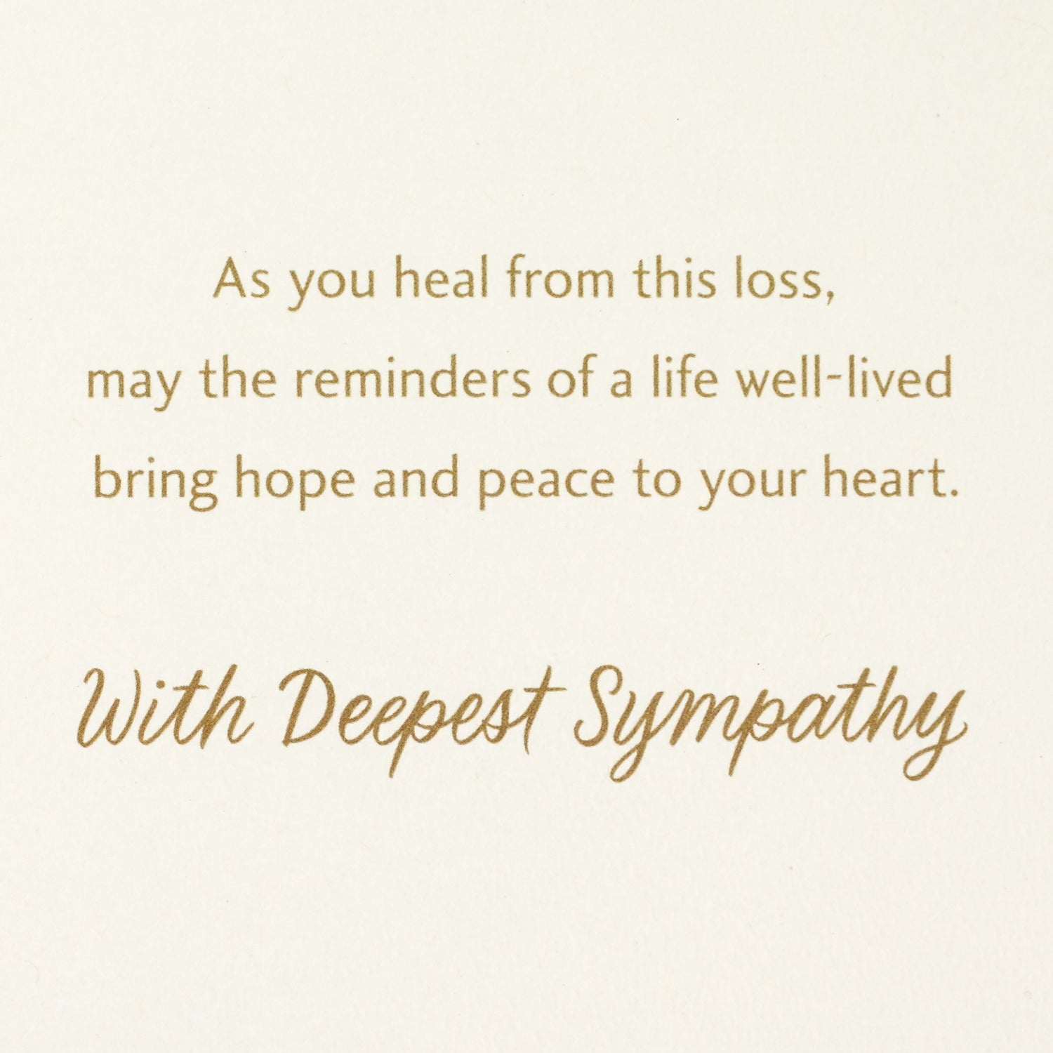 Inside reads: "As you heal from this loss, may the reminders of a life well-lived bring hope and peace to your heart. With deepest sympathy."