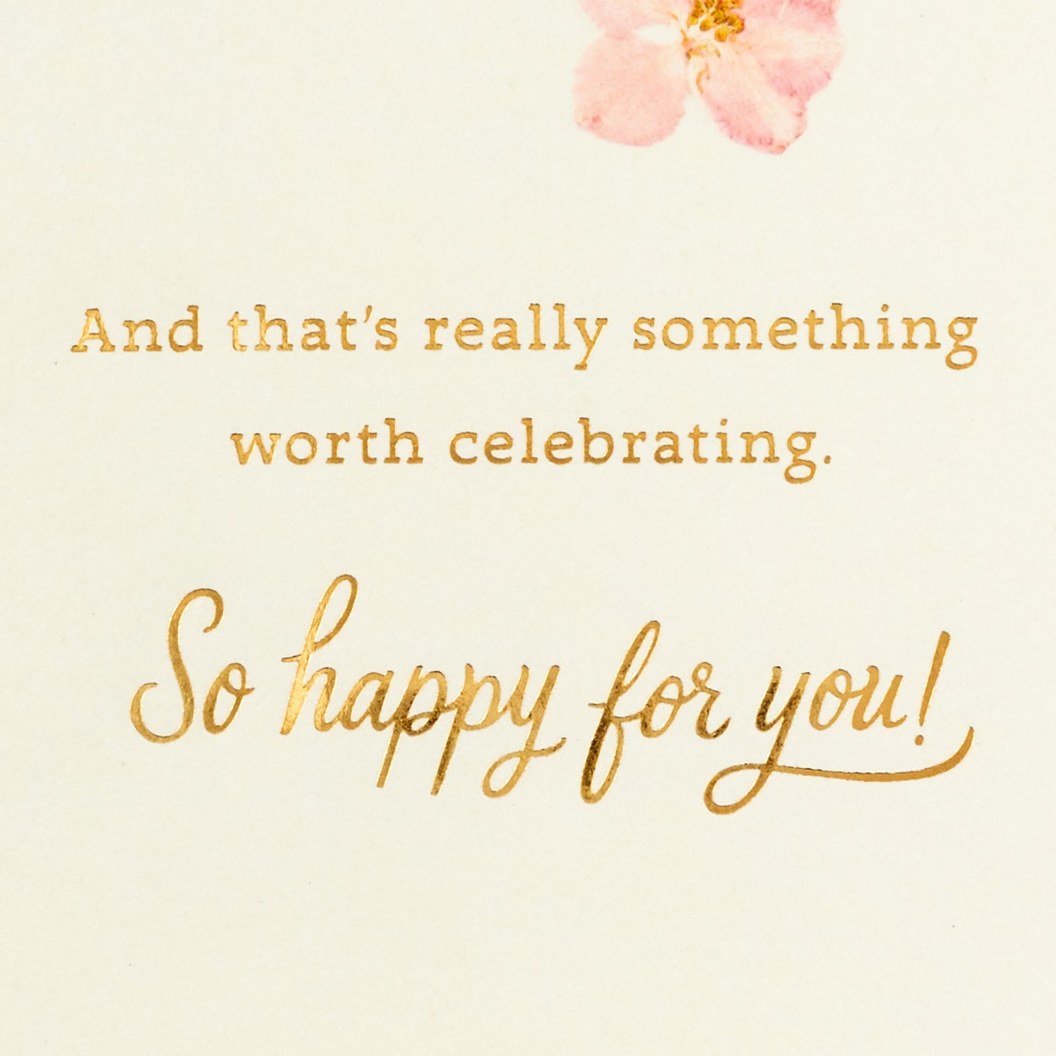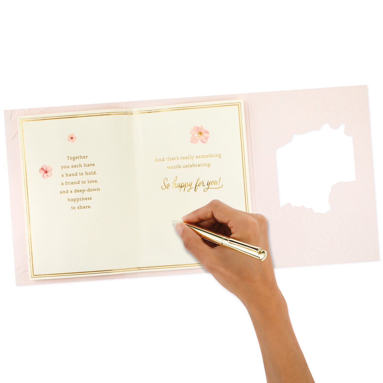 Inside reads: "Together you each have a hand to hold, a friend to love, and a deep-down happiness to share. And that's really something worth celebrating. So happy for you!"