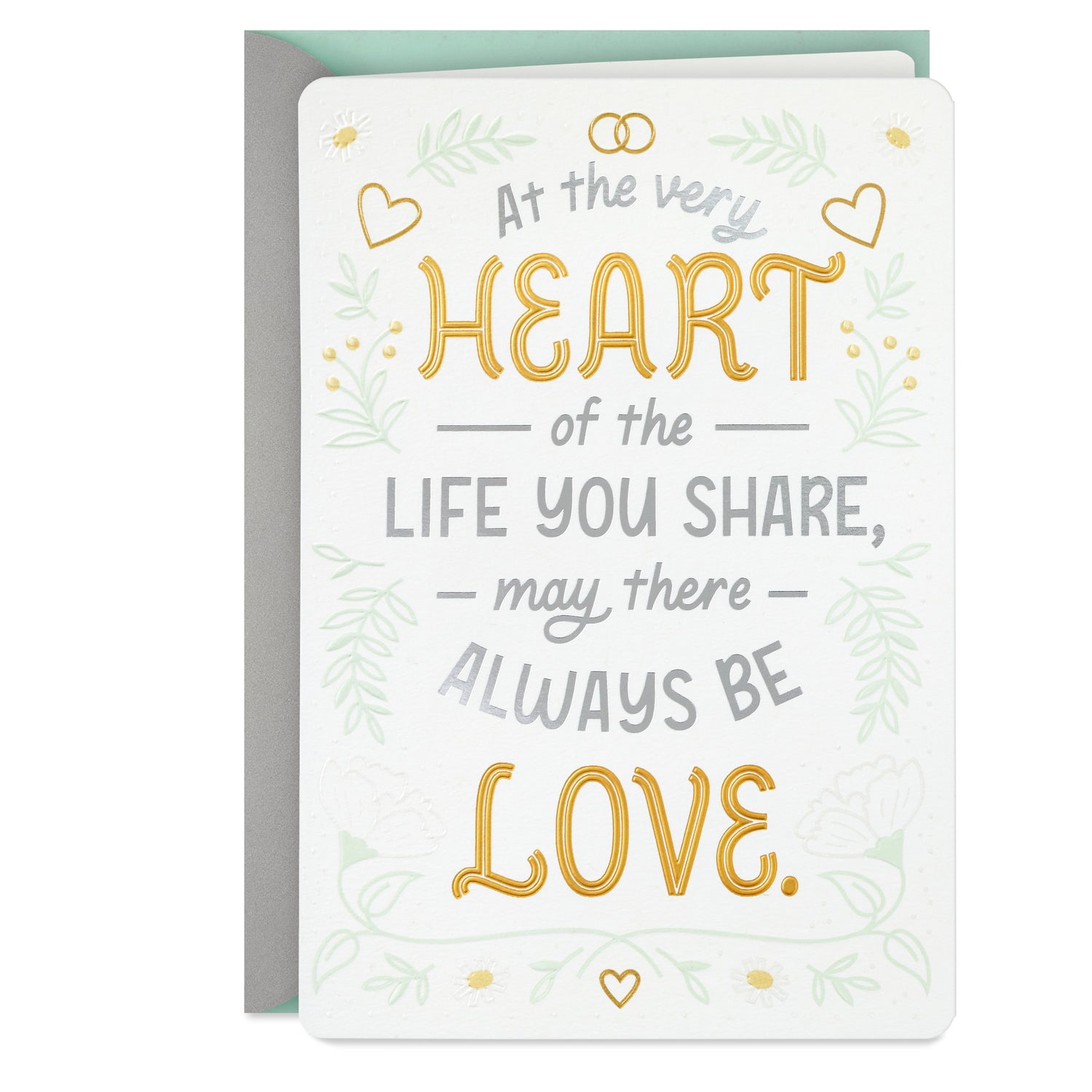 Cover features foil accented lettering on a background of white flowers, greenery, and hearts. Message reads: "At the very heart of the life you share, may there always be love."