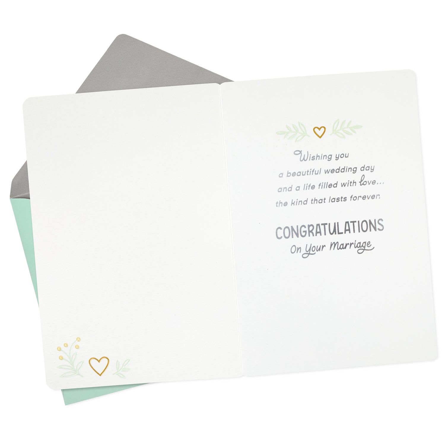 Inside reads: "Wishing you a beautiful wedding day and a life filled with love . . . the kind that lasts forever. Congratulations on your marriage."